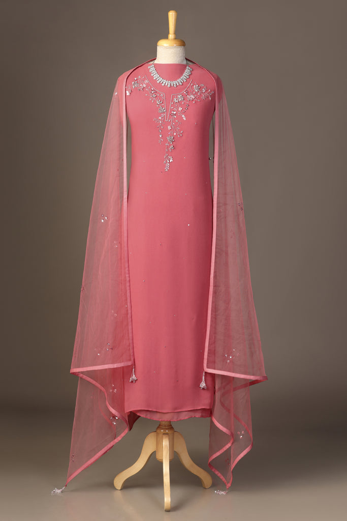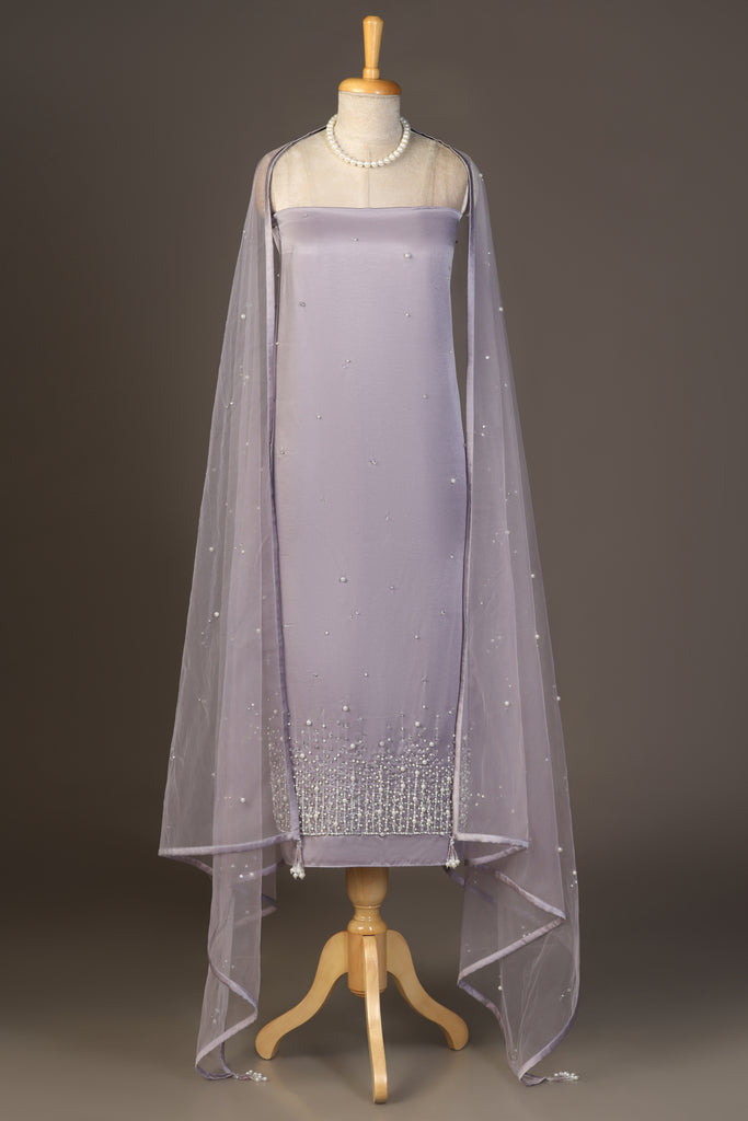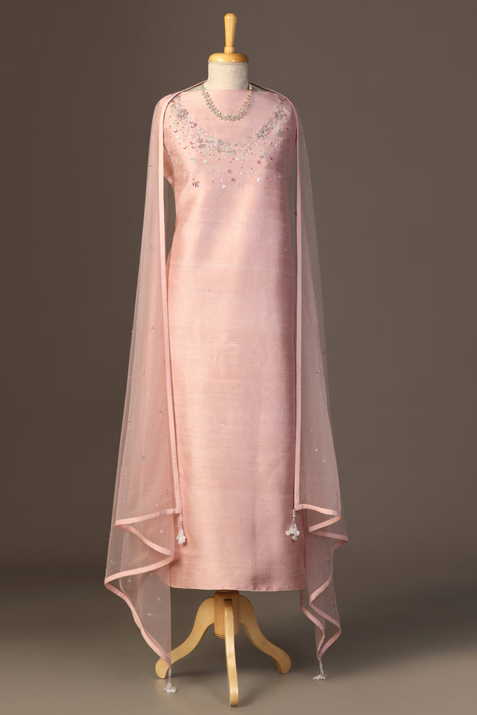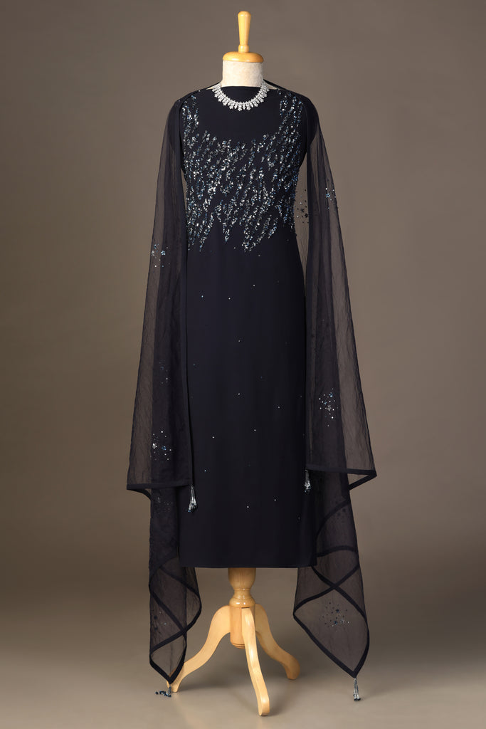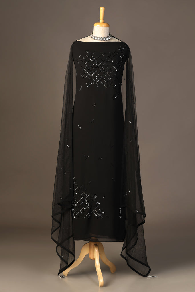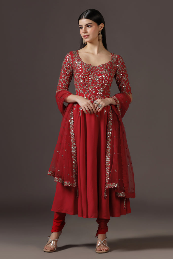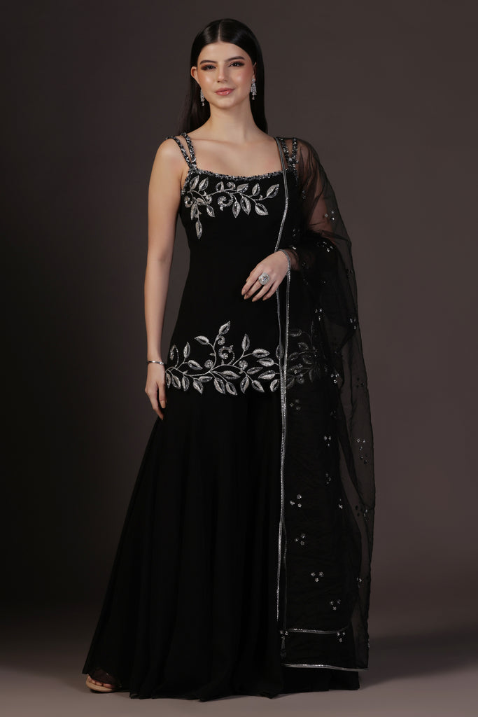 Opulent Lehanga set comprising of a delicate draped embroidered blouse, a sequin and crystal embellished skirt with a long trail and complementing dupatta with a hand embroidered border and scattered embroidery.Shop Now