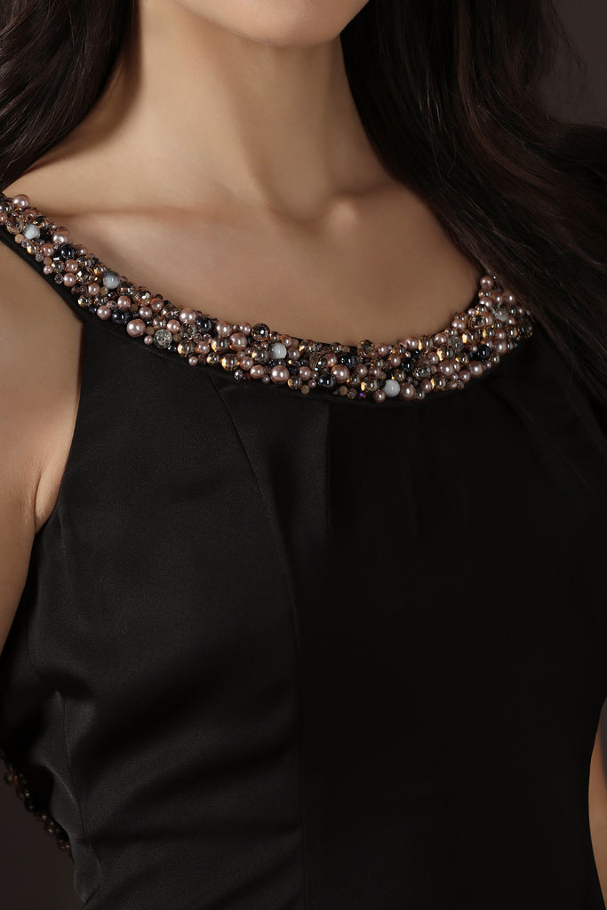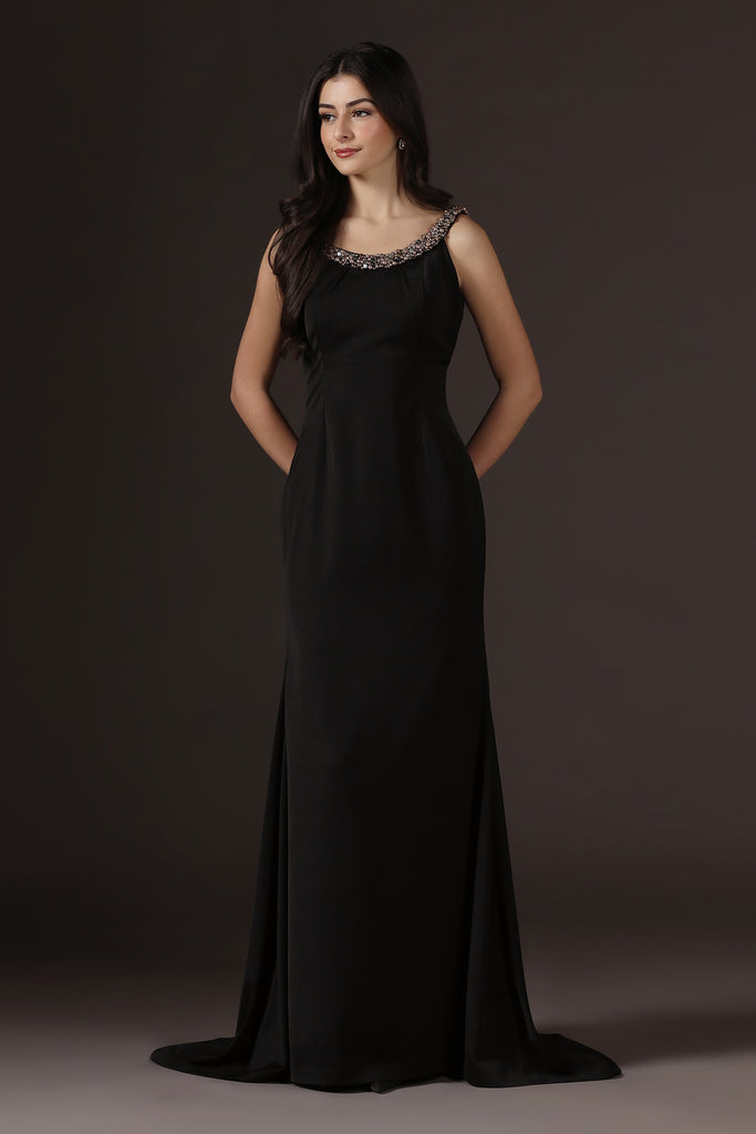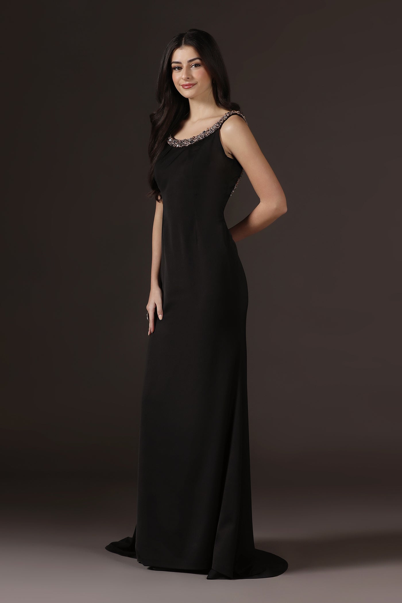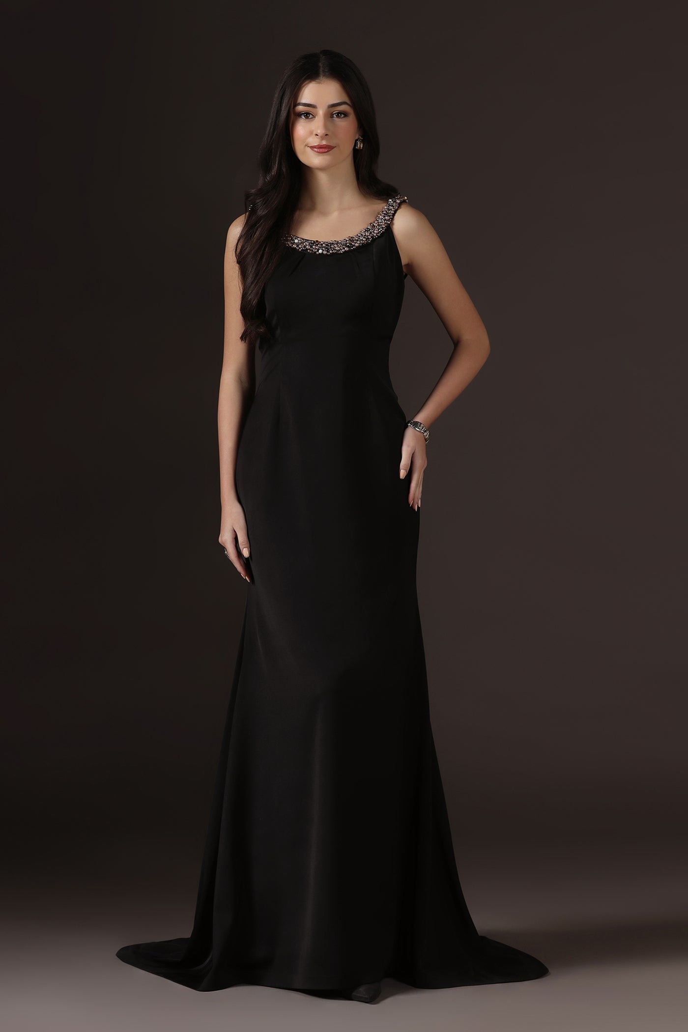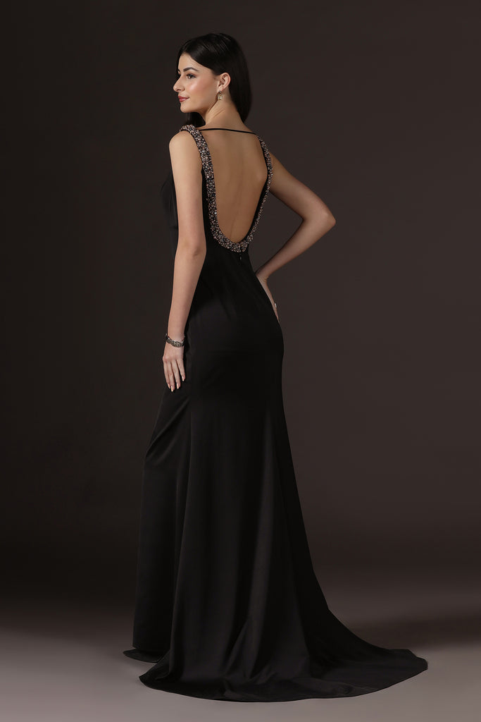 Crafted in premium luxury crepe, this black evening gown features a sleek, body skimming silhouette. Hand embroidered crystal detailing highlights the neckline and deep back, adding a luminous couture touch. The dramatic backless design framed with multi-tone crystals makes it perfect for receptions, formal evenings, and high glam occasions.