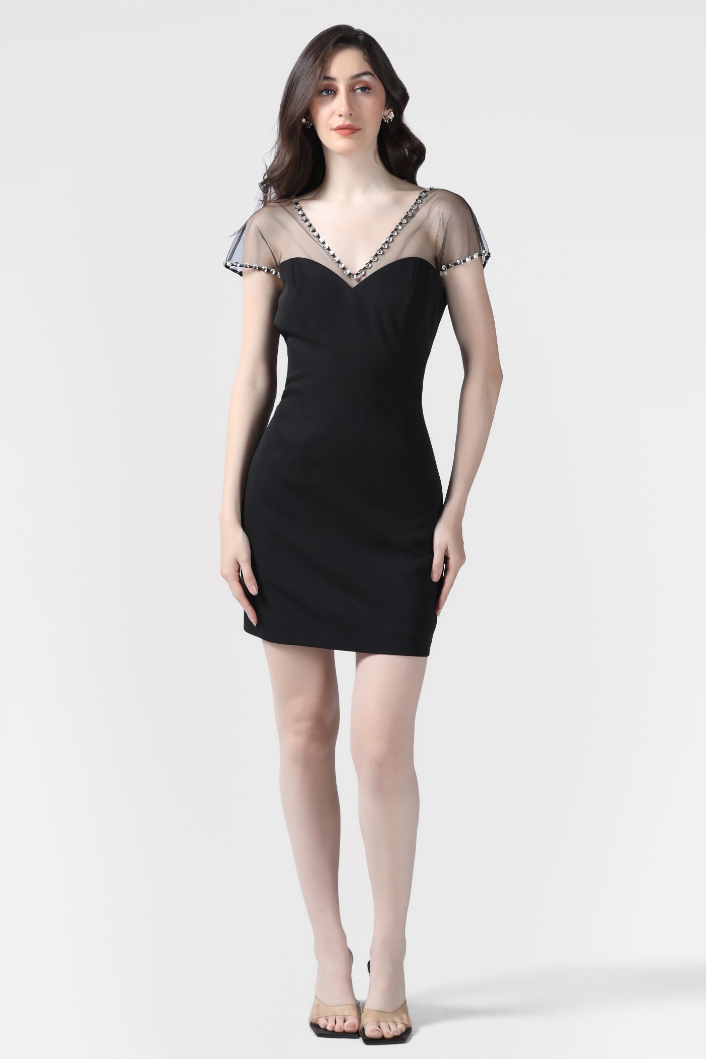 Step into timeless elegance with this black luxury  crepe short dress, designed for parties, cocktail evenings, and special occasions. The dress features a flattering V-neckline and short sheer sleeves, delicately embellished with sparkling crystals that elevate its refined charm. The dress offers a beautifully structured, comfortable fit.