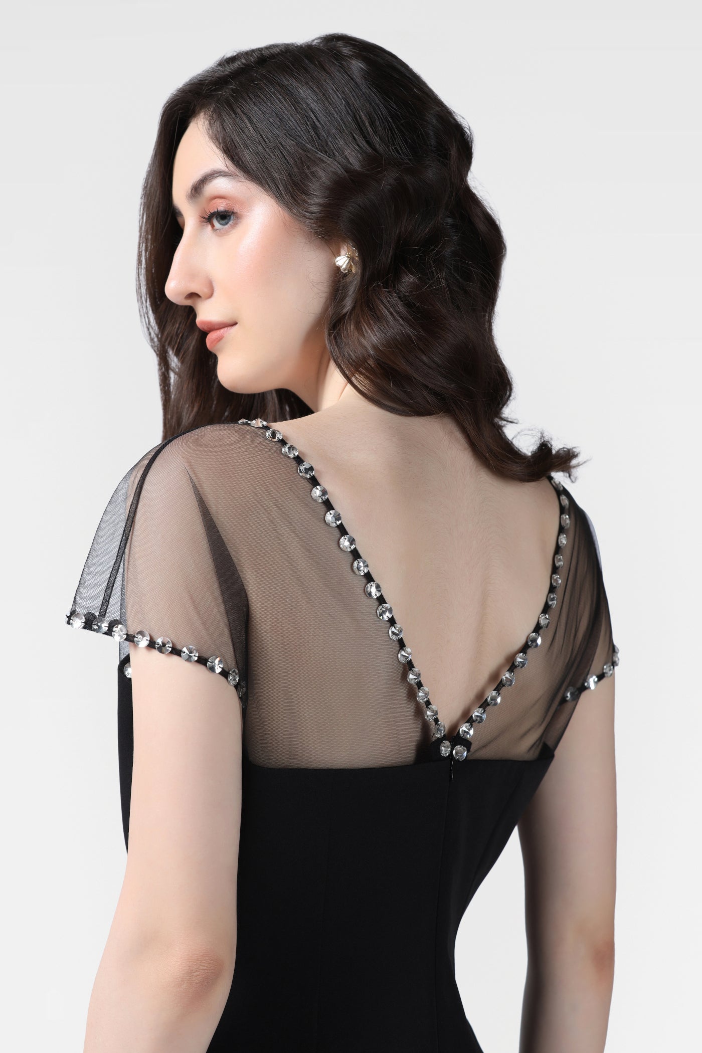 A crystal-embellished V-neckline and sheer short sleeves add refined sparkle