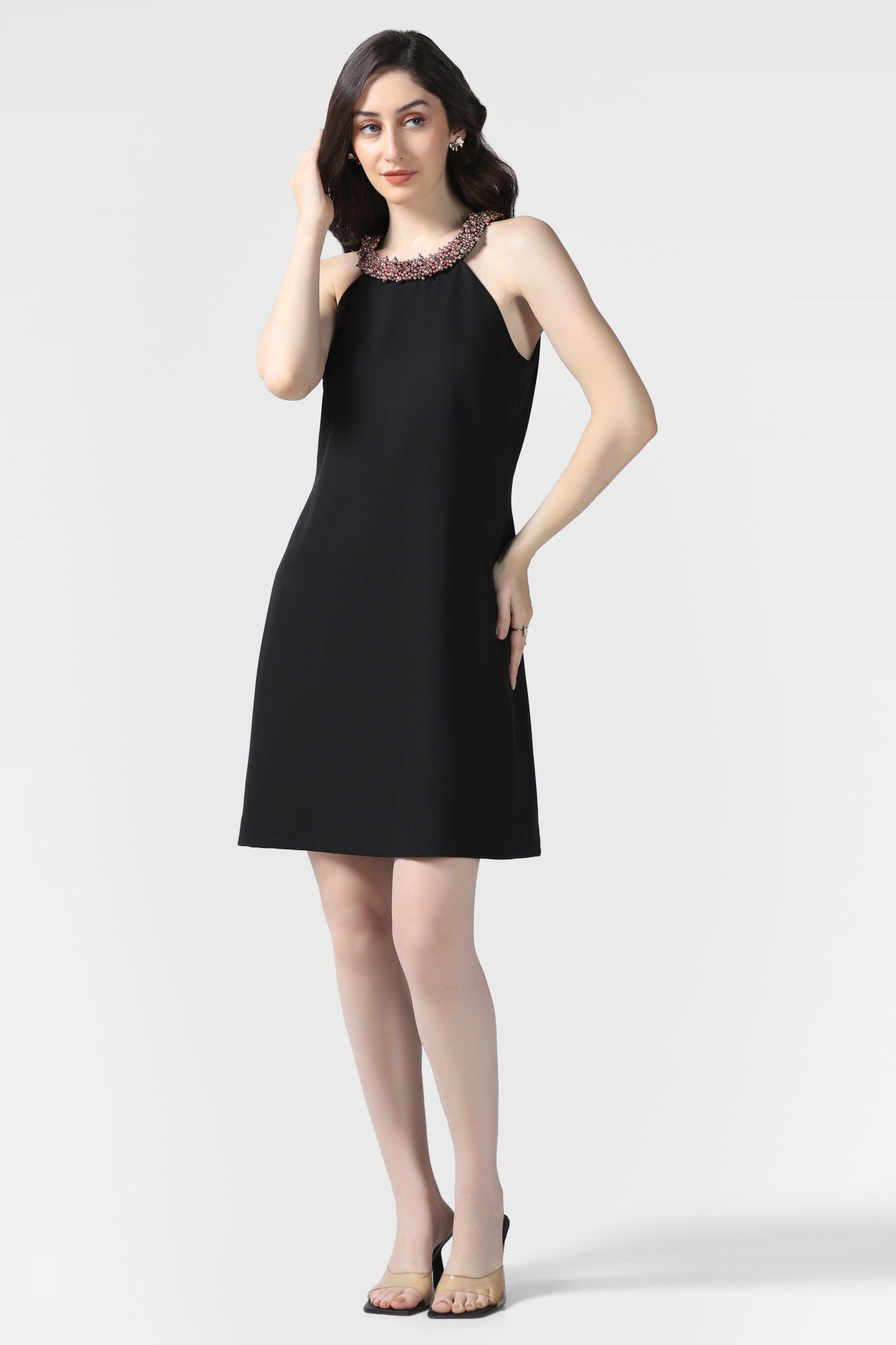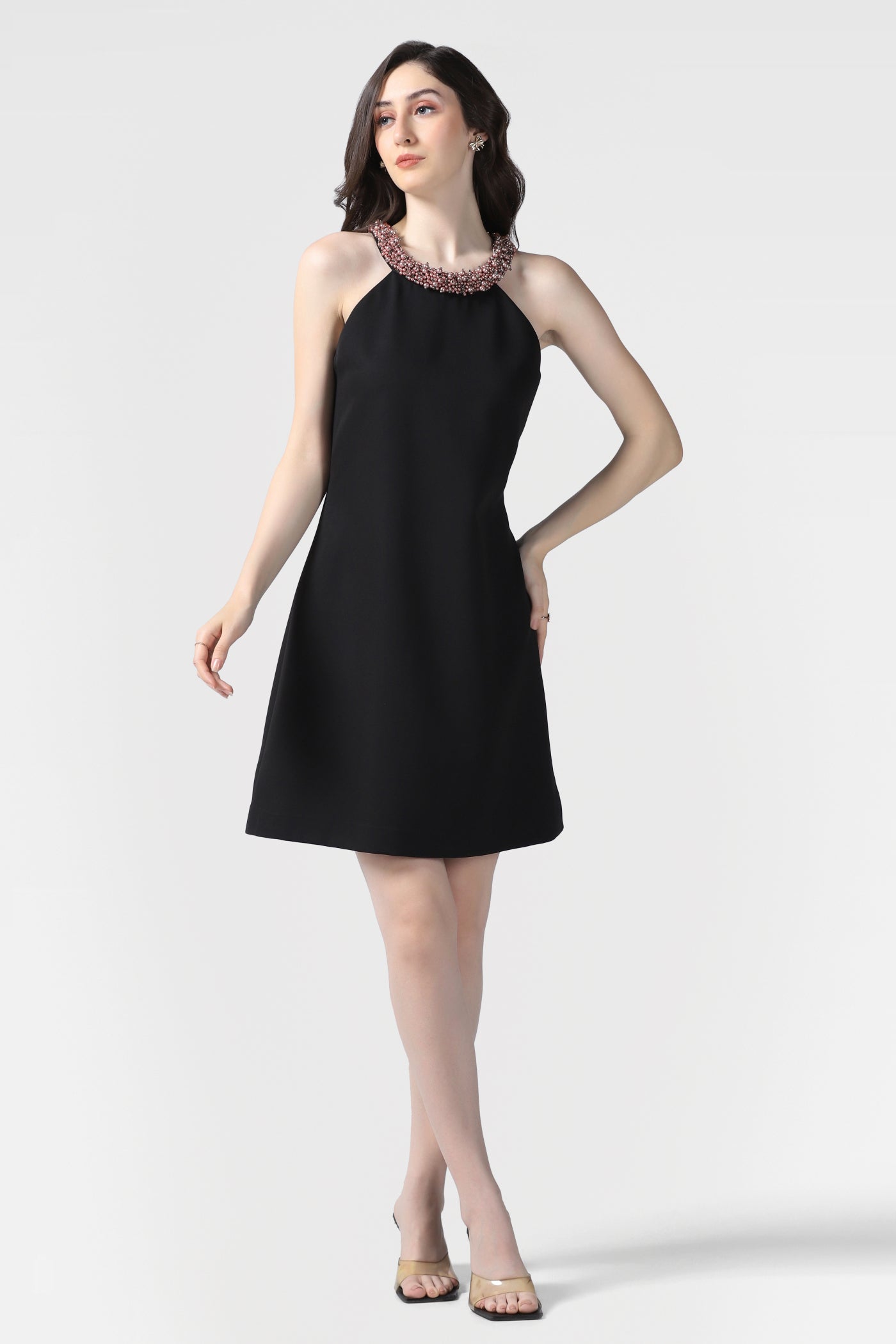 Crafted from luxury crepe, this stunning black dress features a hand embroidered halter neckline adorned with pearls and crystals for a touch of opulent charm. The lined construction ensures a smooth, flattering fall, while a concealed zip closure adds a seamless finish. This piece is perfect for birthday parties, evening events, and elegant celebrations.