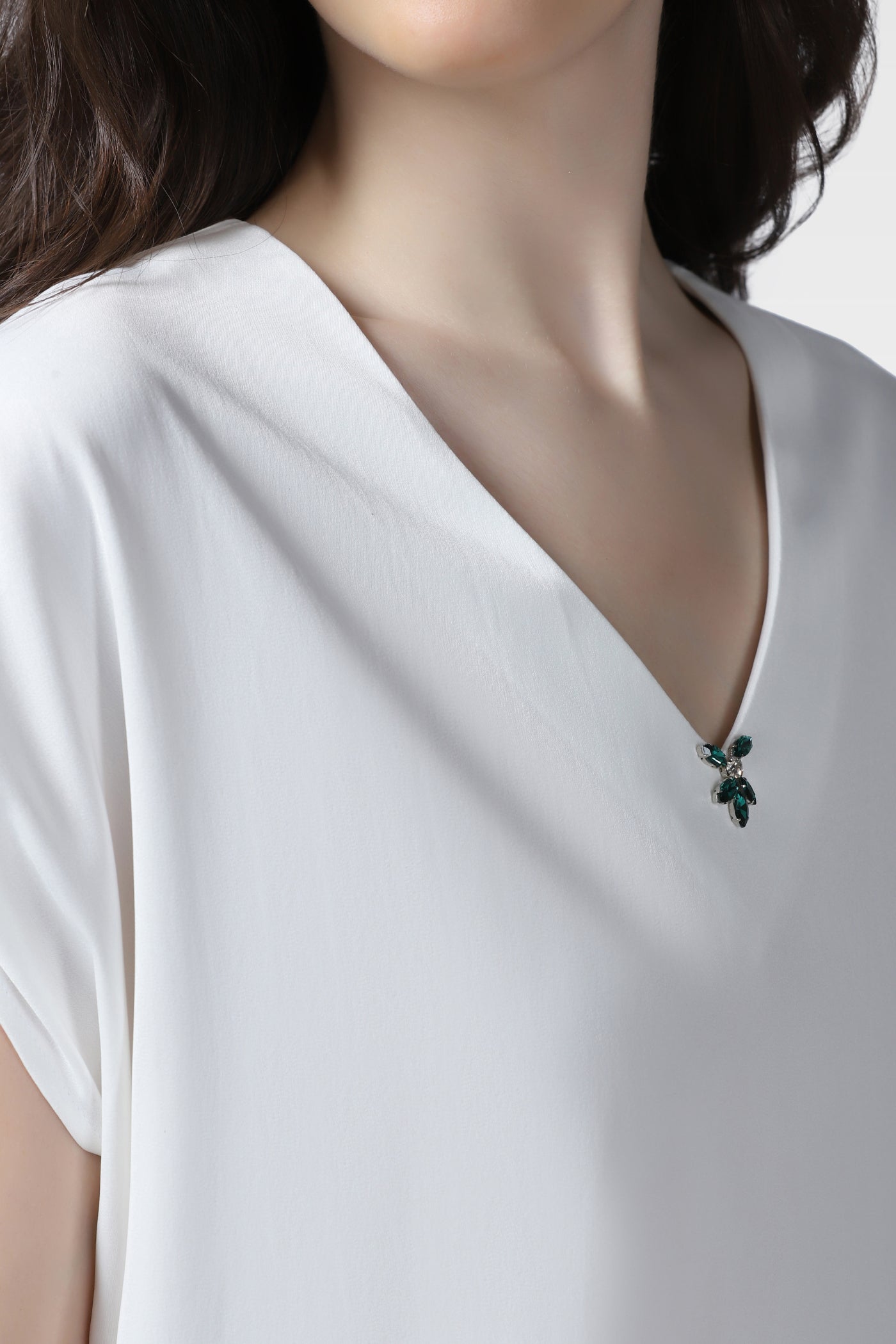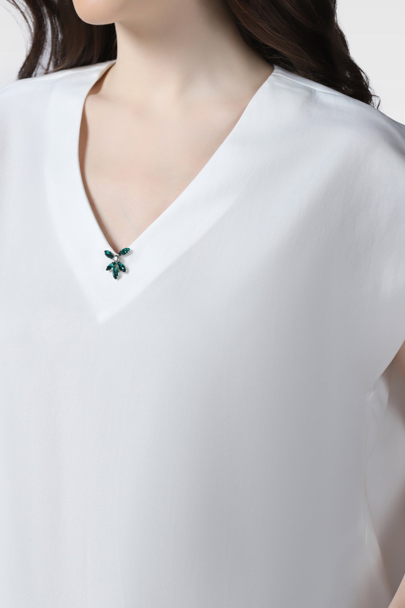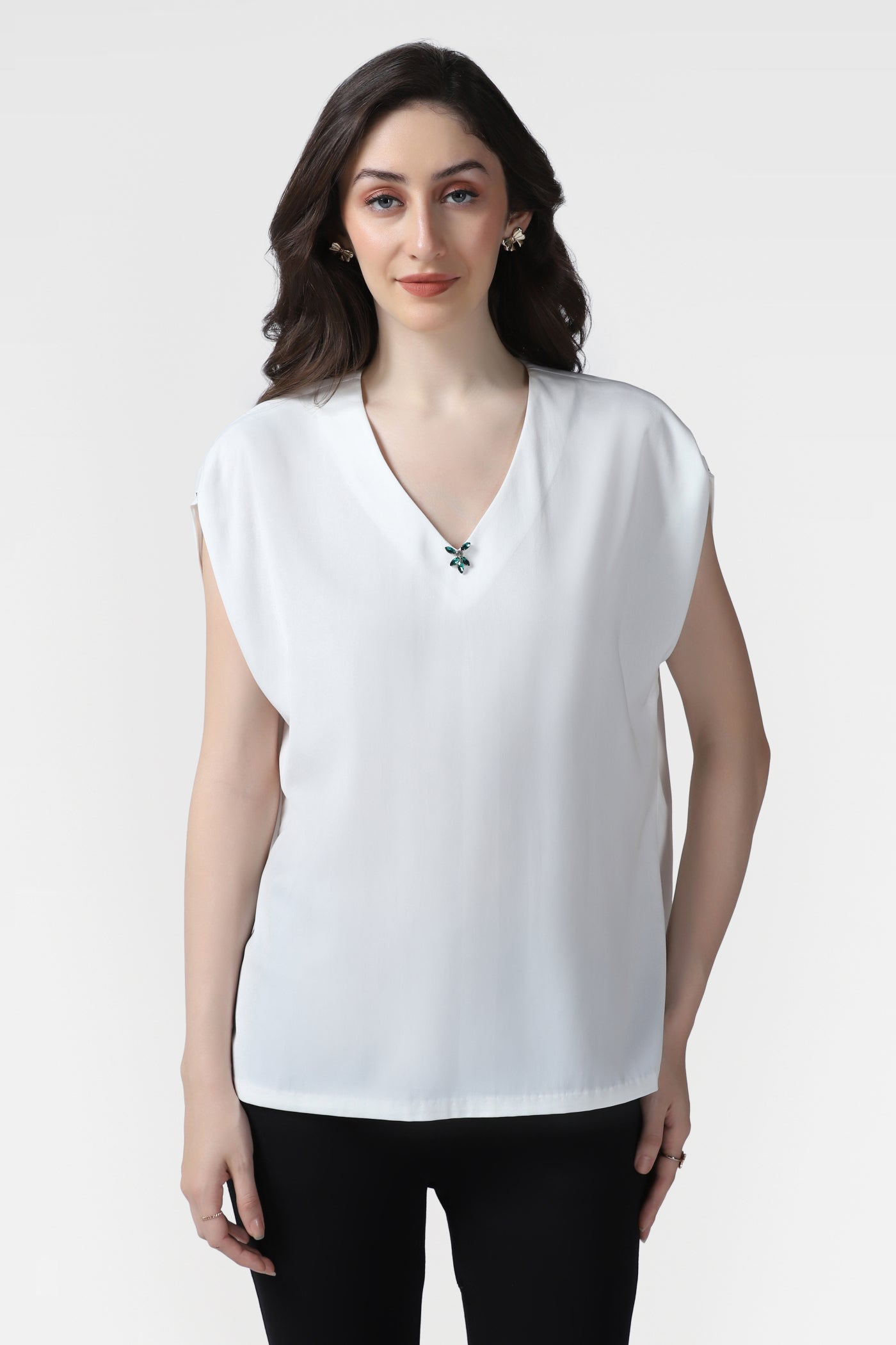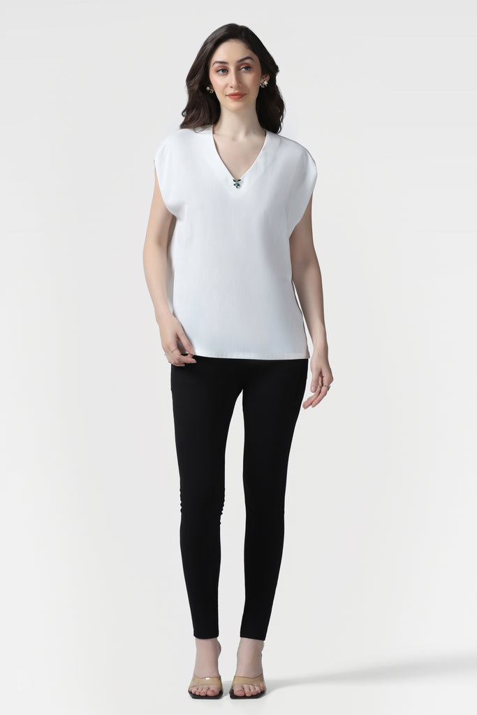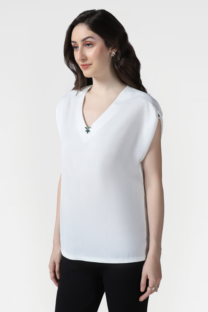 Elegant White V-Neck Top with Hand Embroidered Crystal Detailing