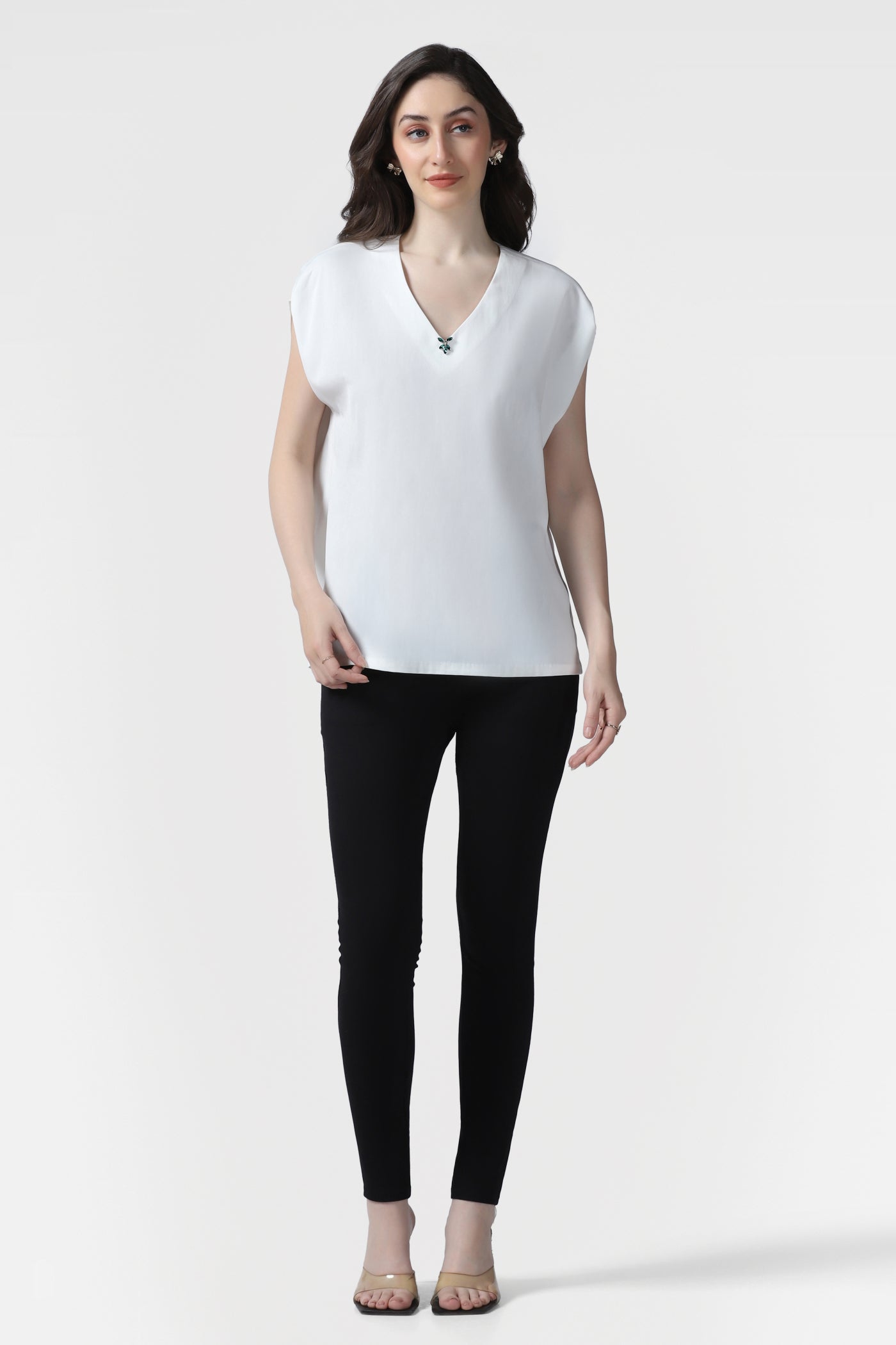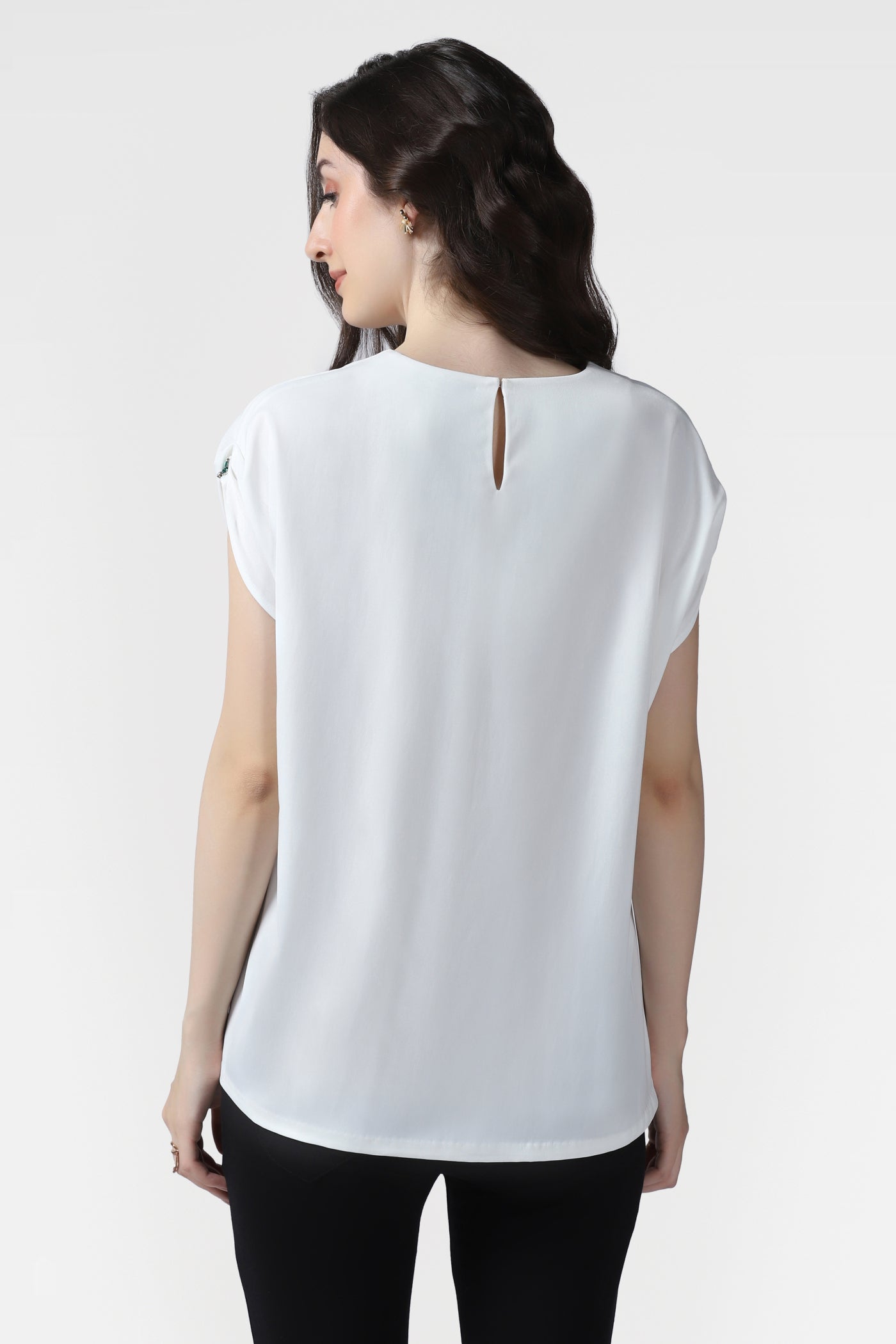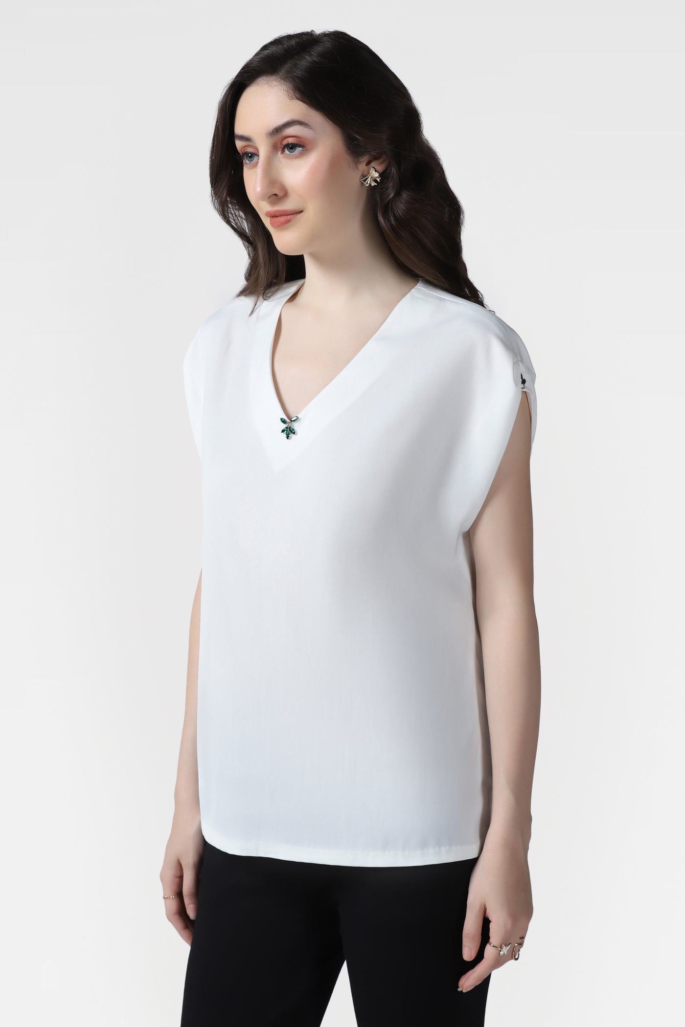 Elevate your style with this luxurious white top crafted from premium crepe fabric. Designed with a graceful V-neckline and cap sleeves, this piece exudes understated sophistication. Hand embroidered with sparkling multi shaped crystals on the neckline and sleeves, it adds a touch of glamour perfect for birthday parties, events, or elegant gatherings.