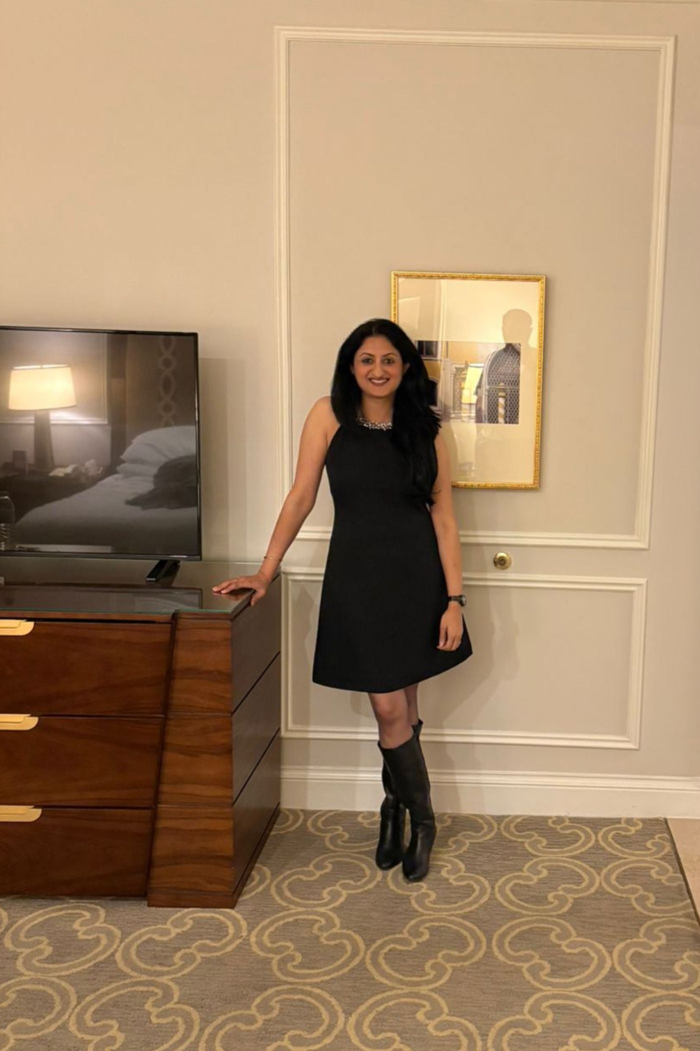 Crafted from luxury crepe, this stunning black dress features a hand embroidered halter neckline adorned with pearls and crystals for a touch of opulent charm. The lined construction ensures a smooth, flattering fall, while a concealed zip closure adds a seamless finish. This piece is perfect for birthday parties, evening events, and elegant celebrations.