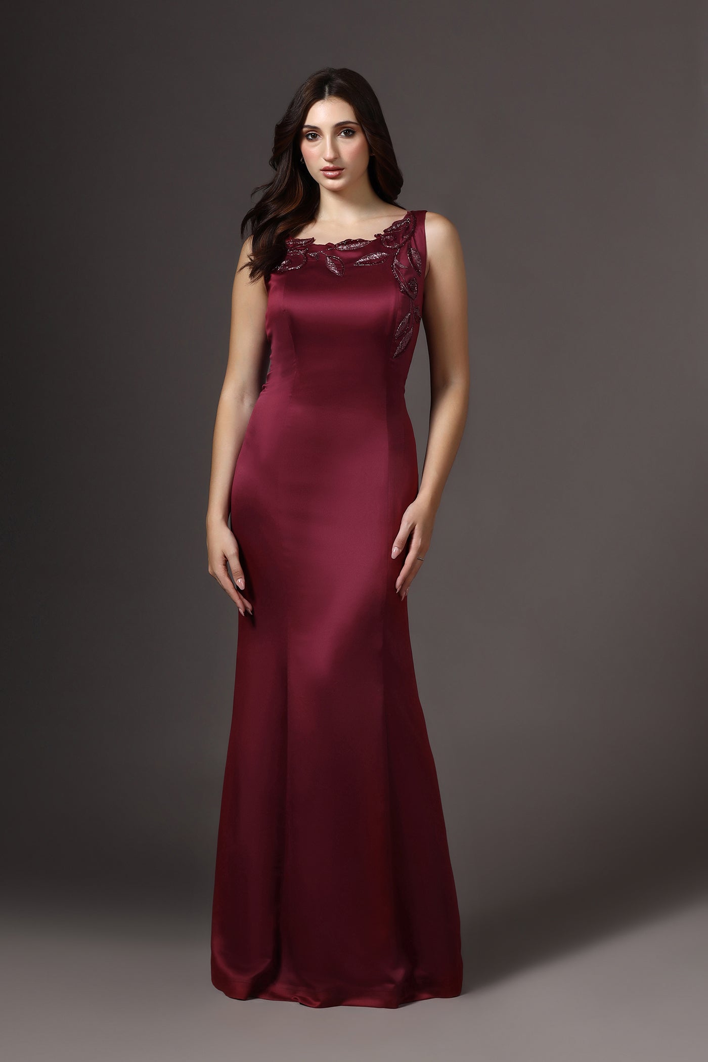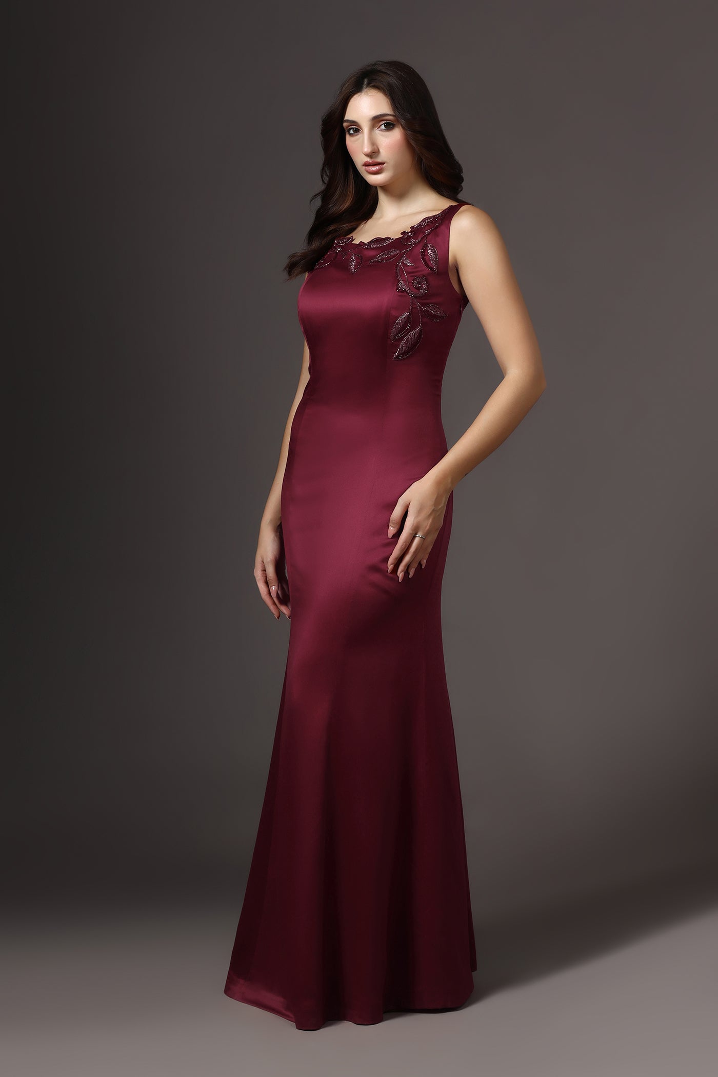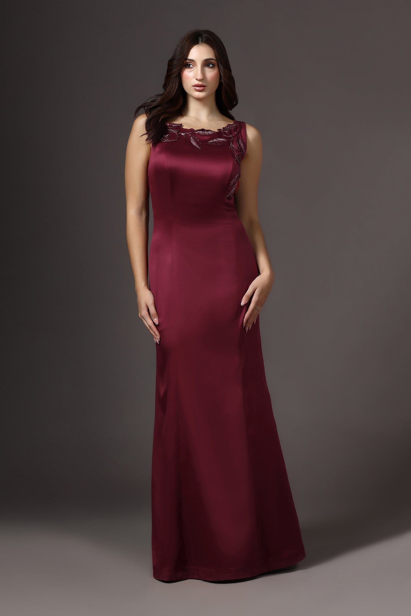 Red Boat Neck Embellished Gown