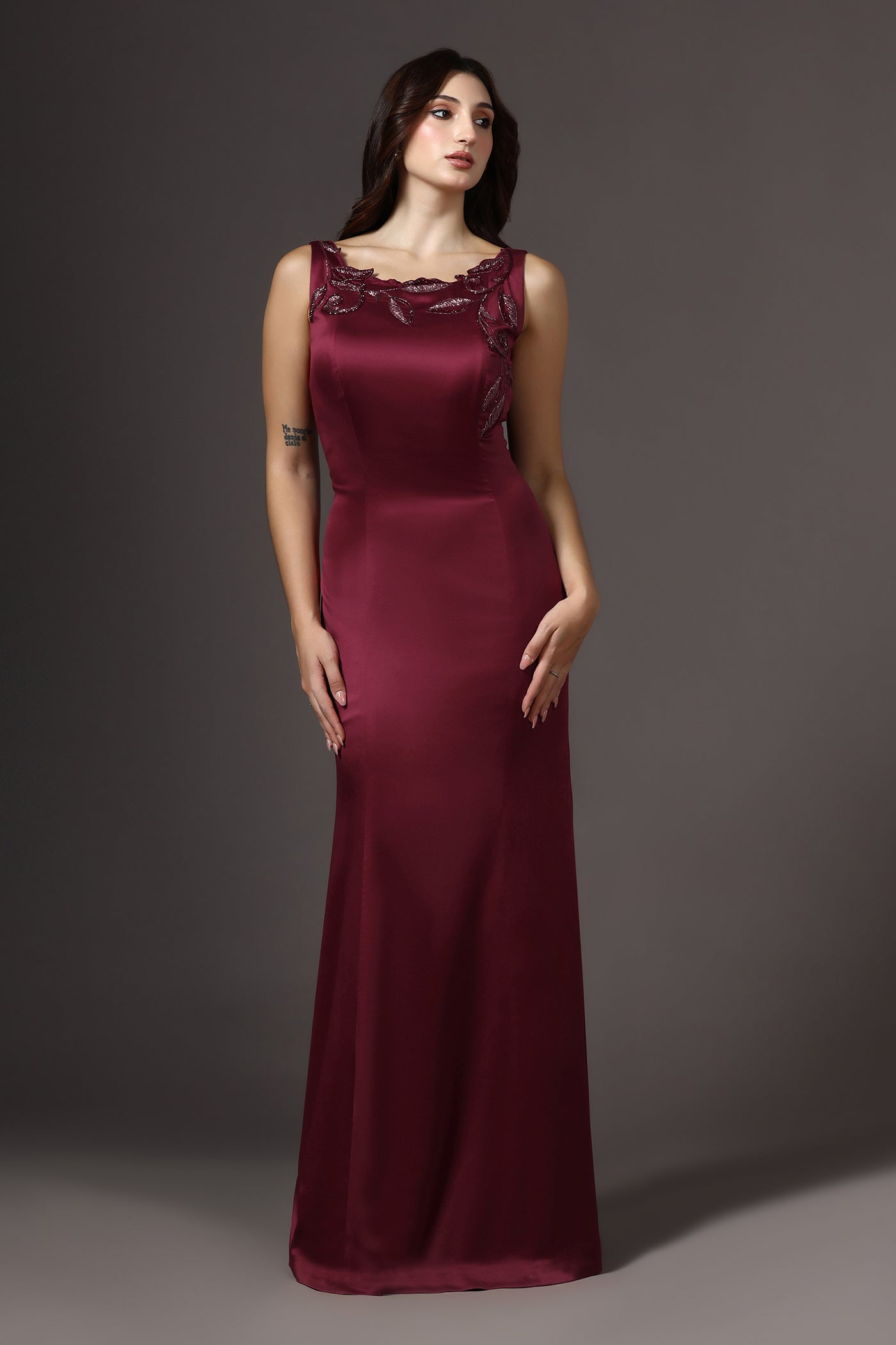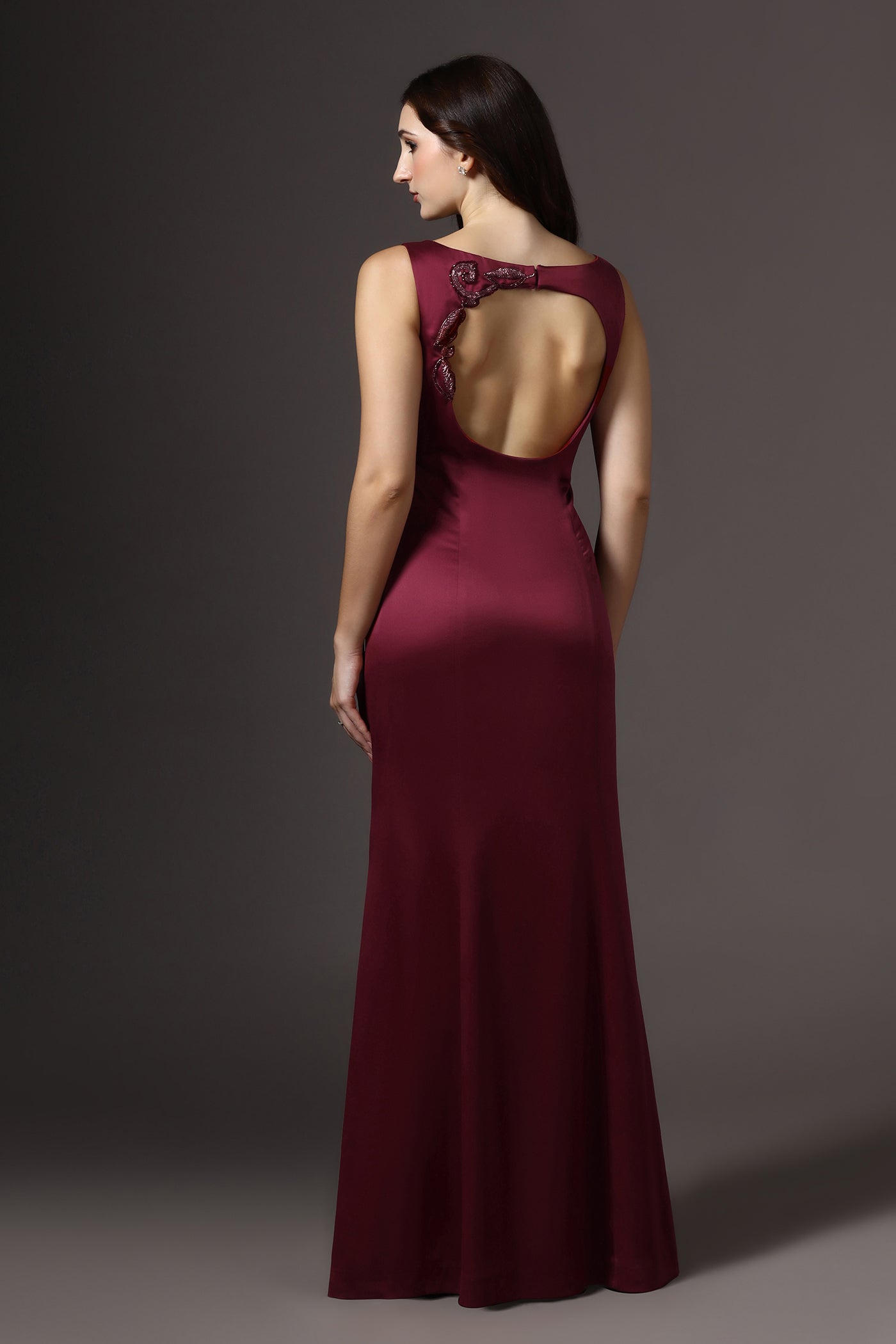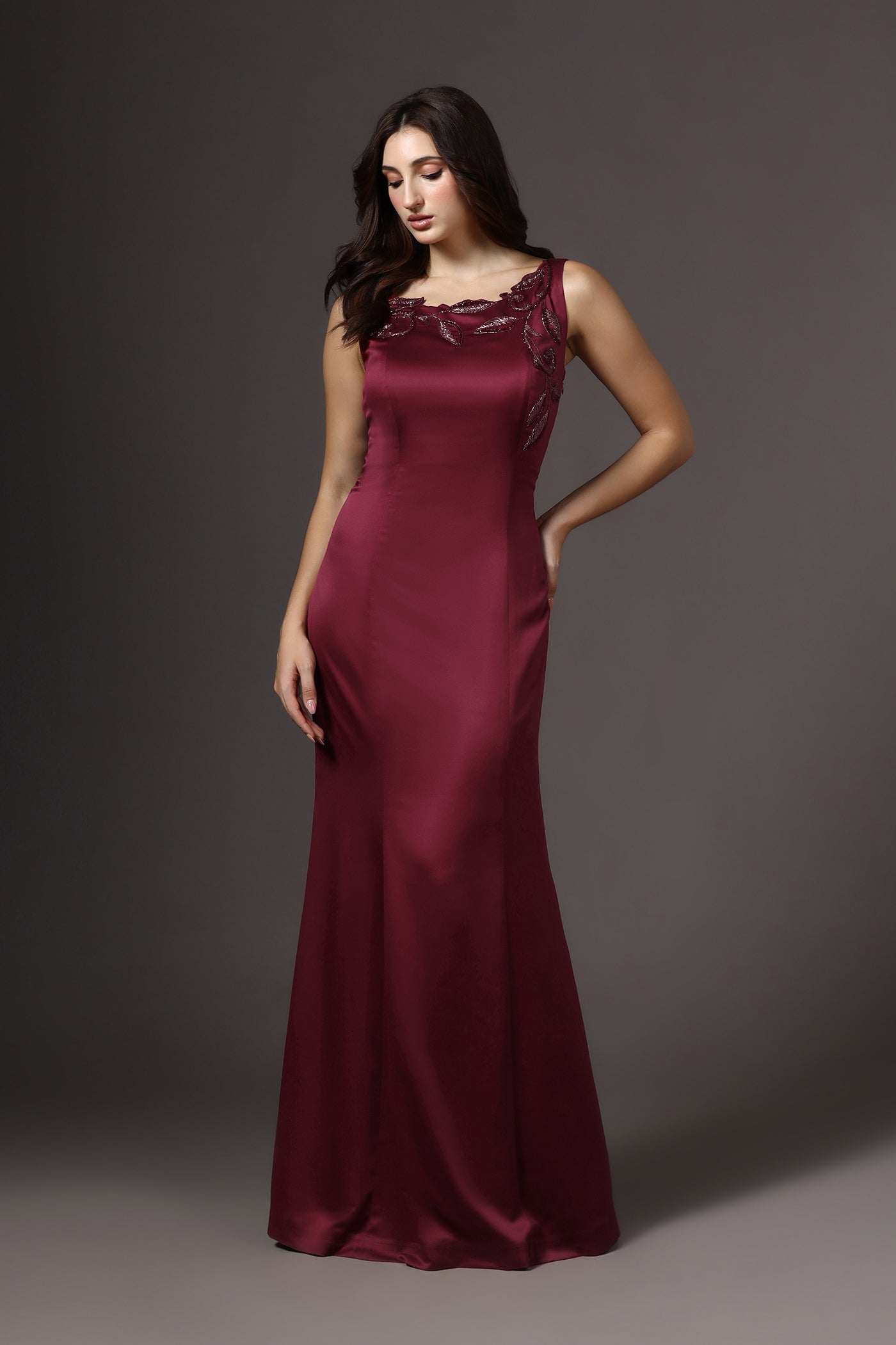 Red Boat Neck Embellished Gown