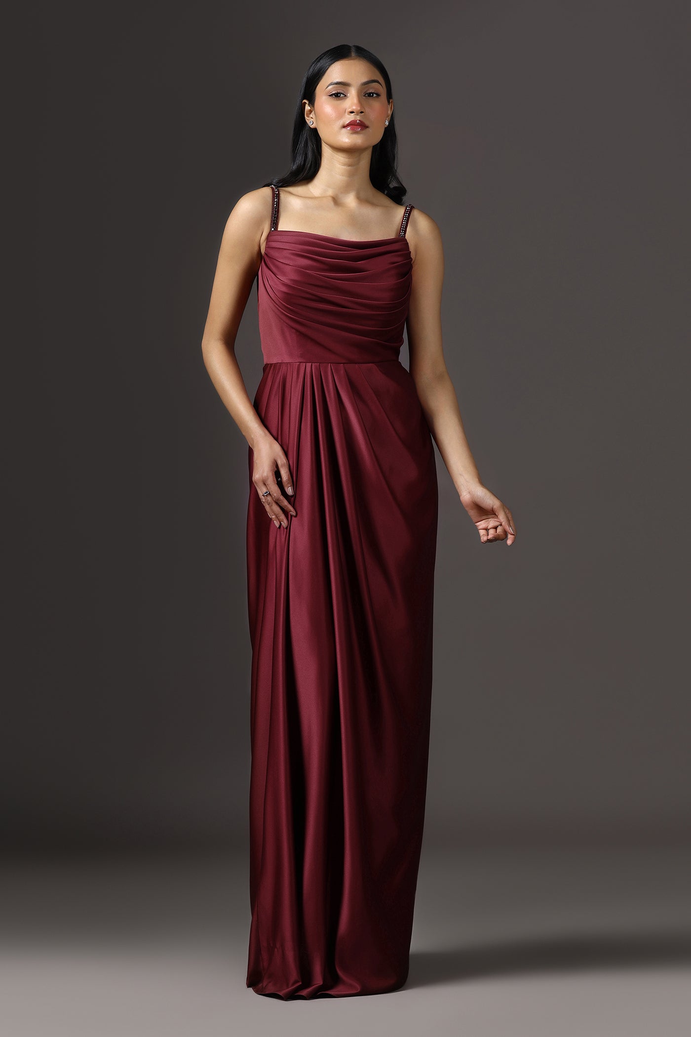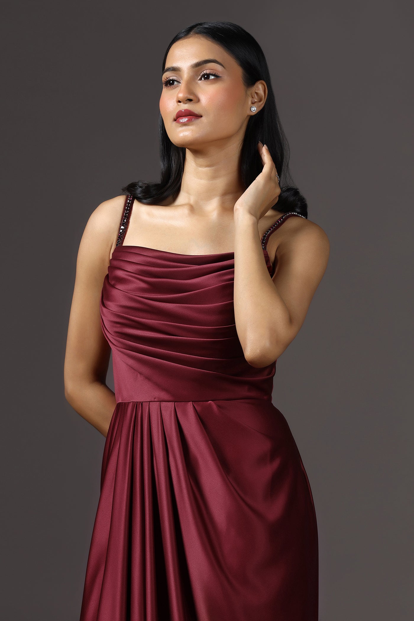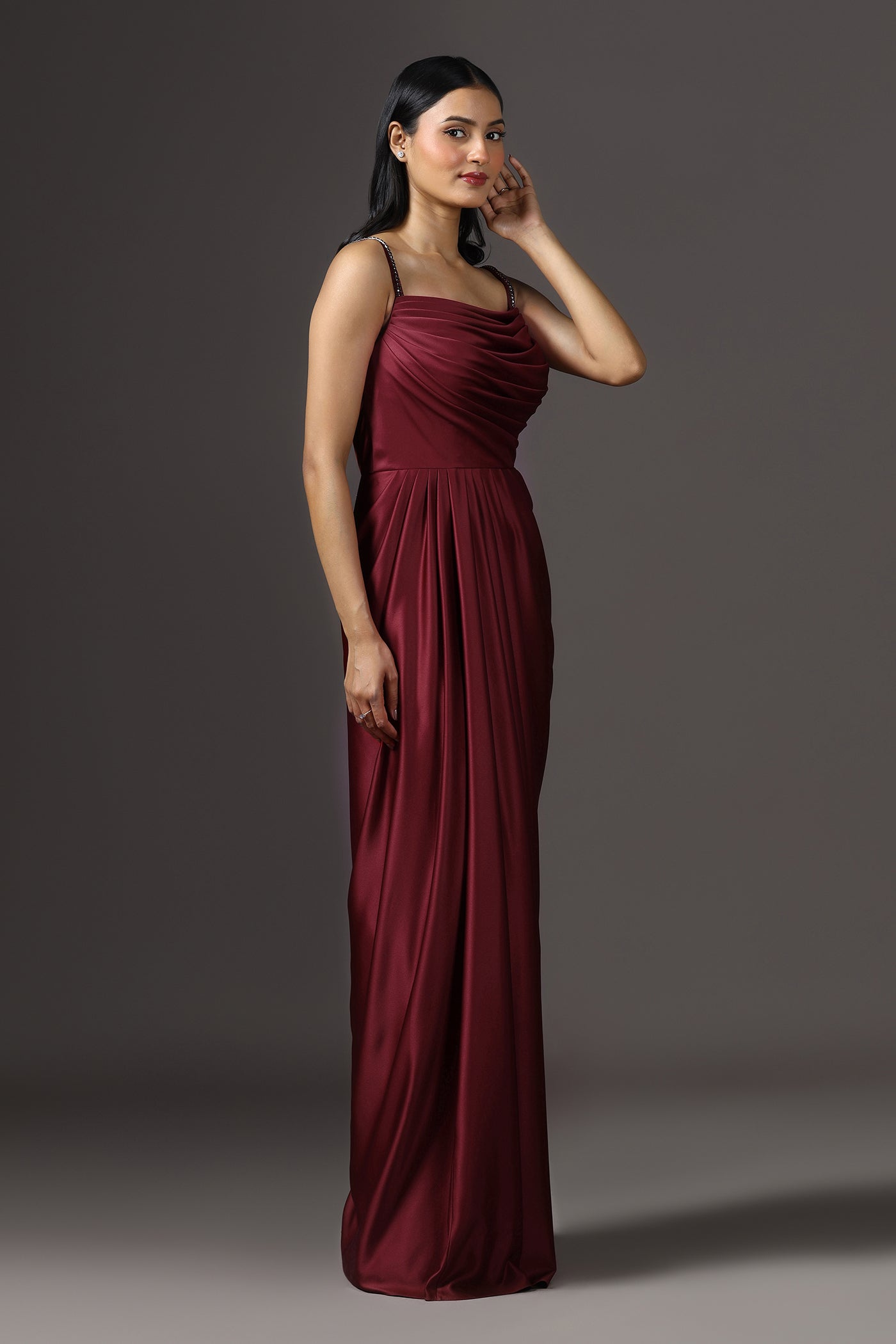 Step into timeless elegance with this luxurious red evening gown, crafted in premium crepe fabric with a smooth satin lining for a flawless drape and soft finish. The structured bodice is adorned with hand embroidered crystals and beads, adding a subtle shimmer, while the draped detailing enhances the silhouette and flows into a graceful, elongated skirt. Perfect for formal parties, cocktail nights, and special occasions, this gown exudes modern sophistication with classic charm.