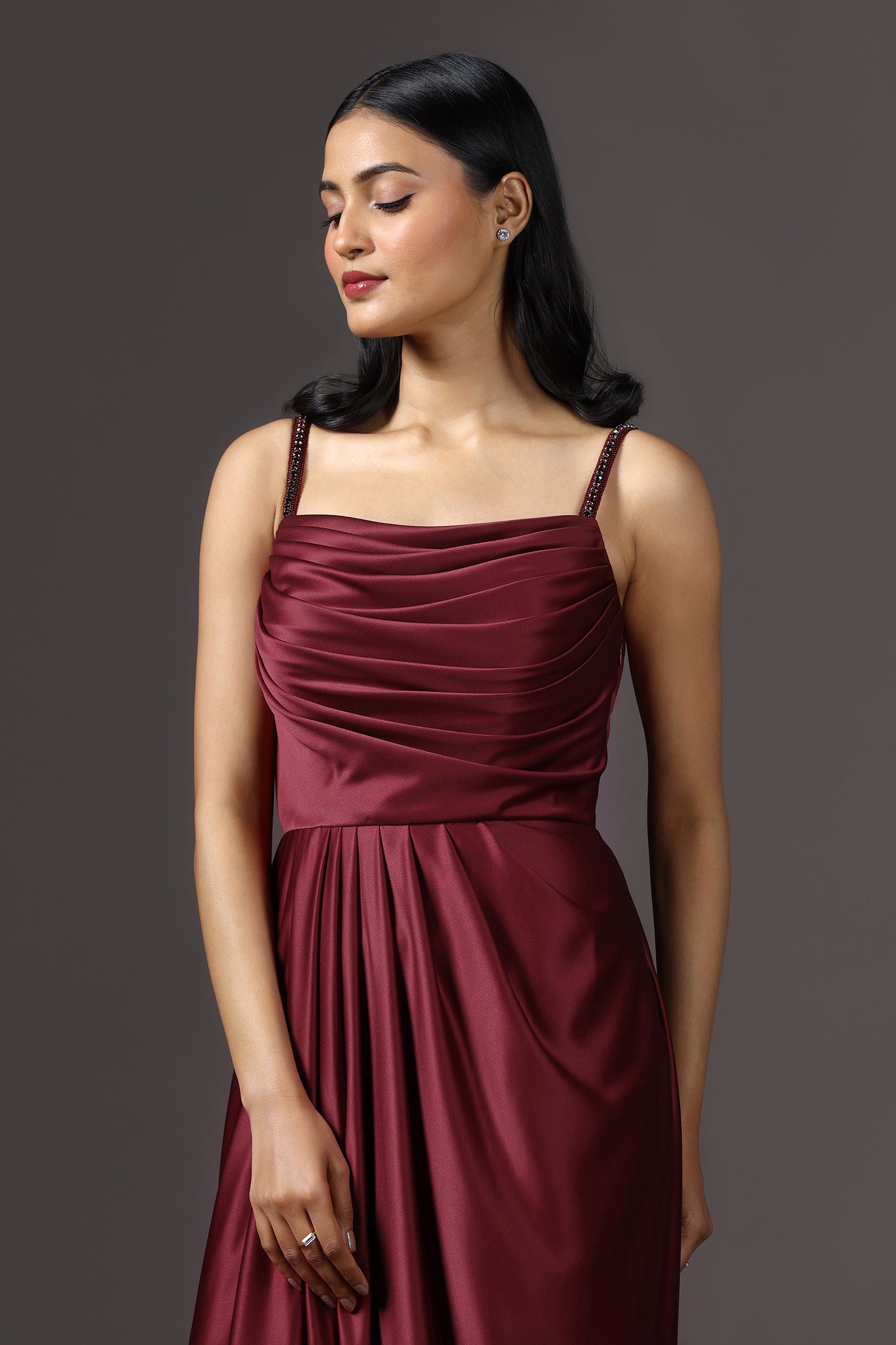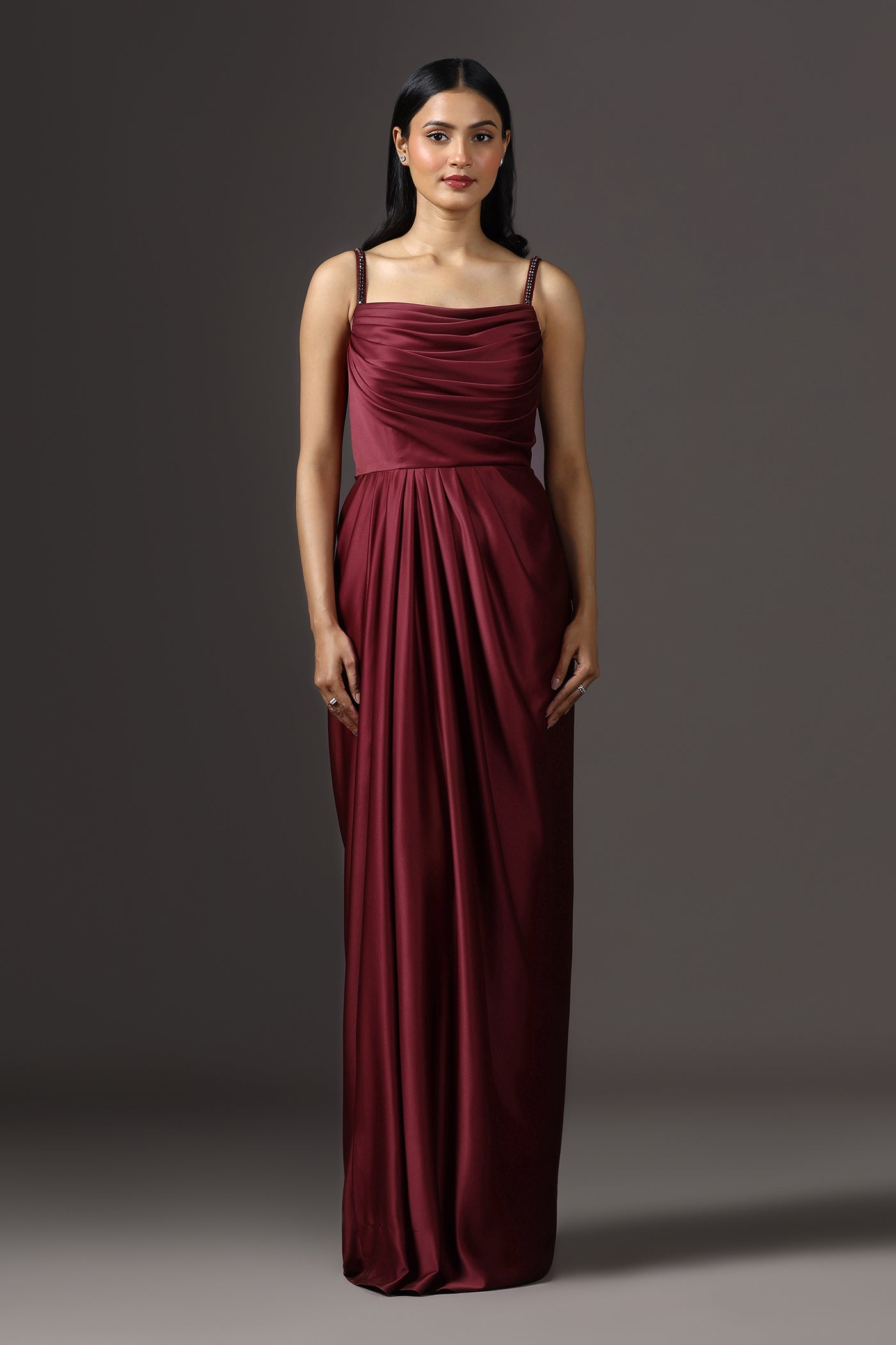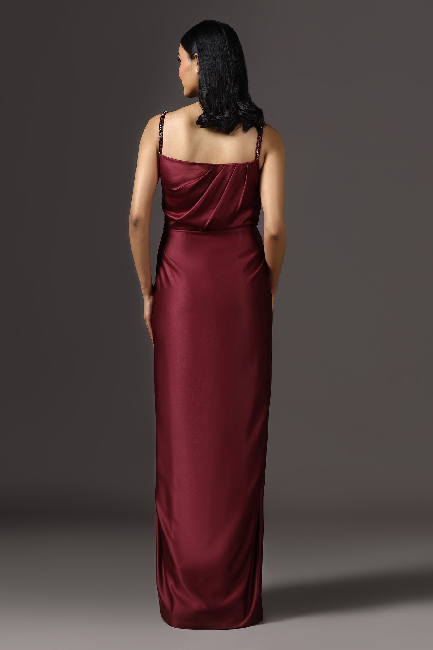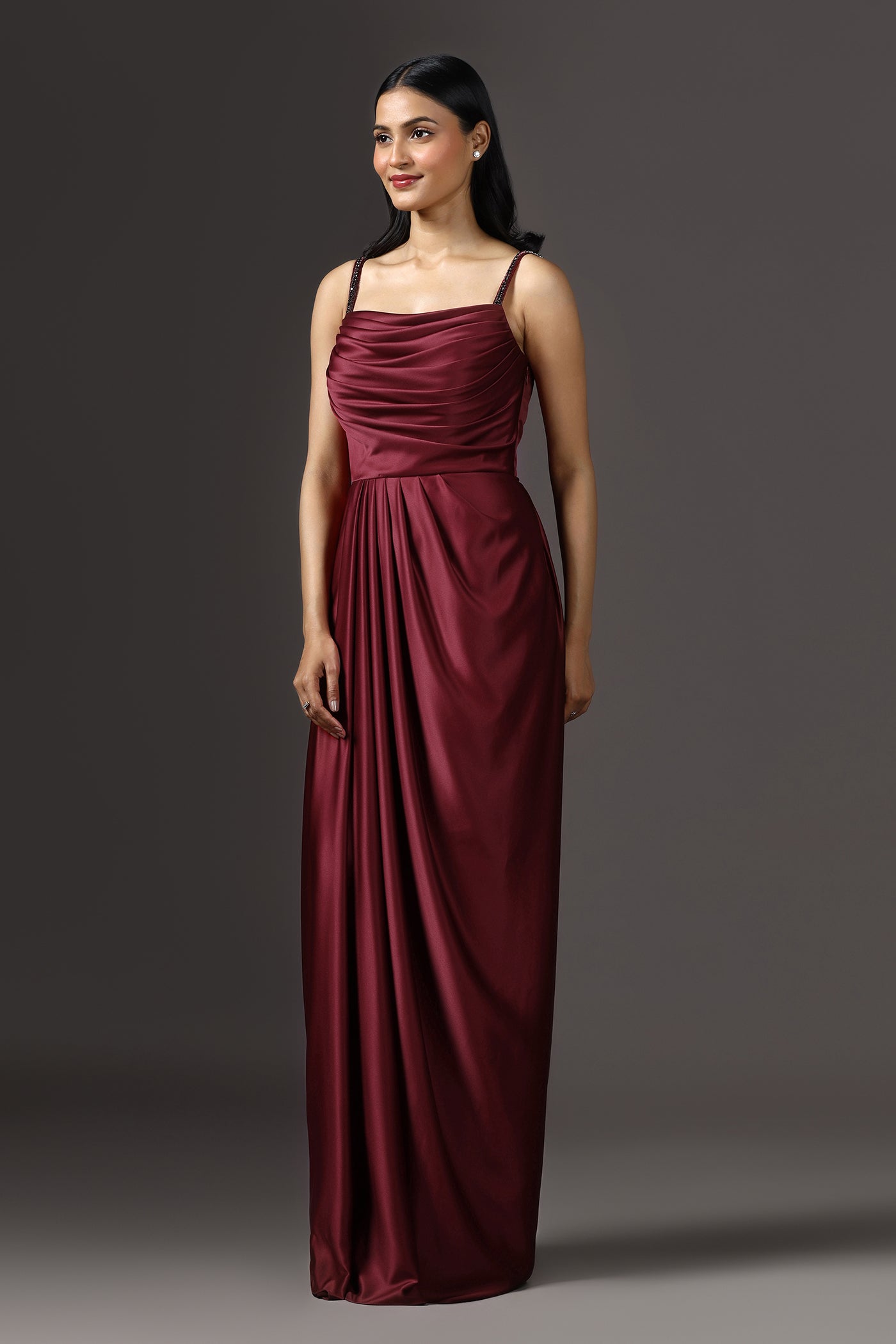 Step into timeless elegance with this luxurious red evening gown, crafted in premium crepe fabric with a smooth satin lining for a flawless drape and soft finish. The structured bodice is adorned with hand embroidered crystals and beads, adding a subtle shimmer, while the draped detailing enhances the silhouette and flows into a graceful, elongated skirt. Perfect for formal parties, cocktail nights, and special occasions, this gown exudes modern sophistication with classic charm.