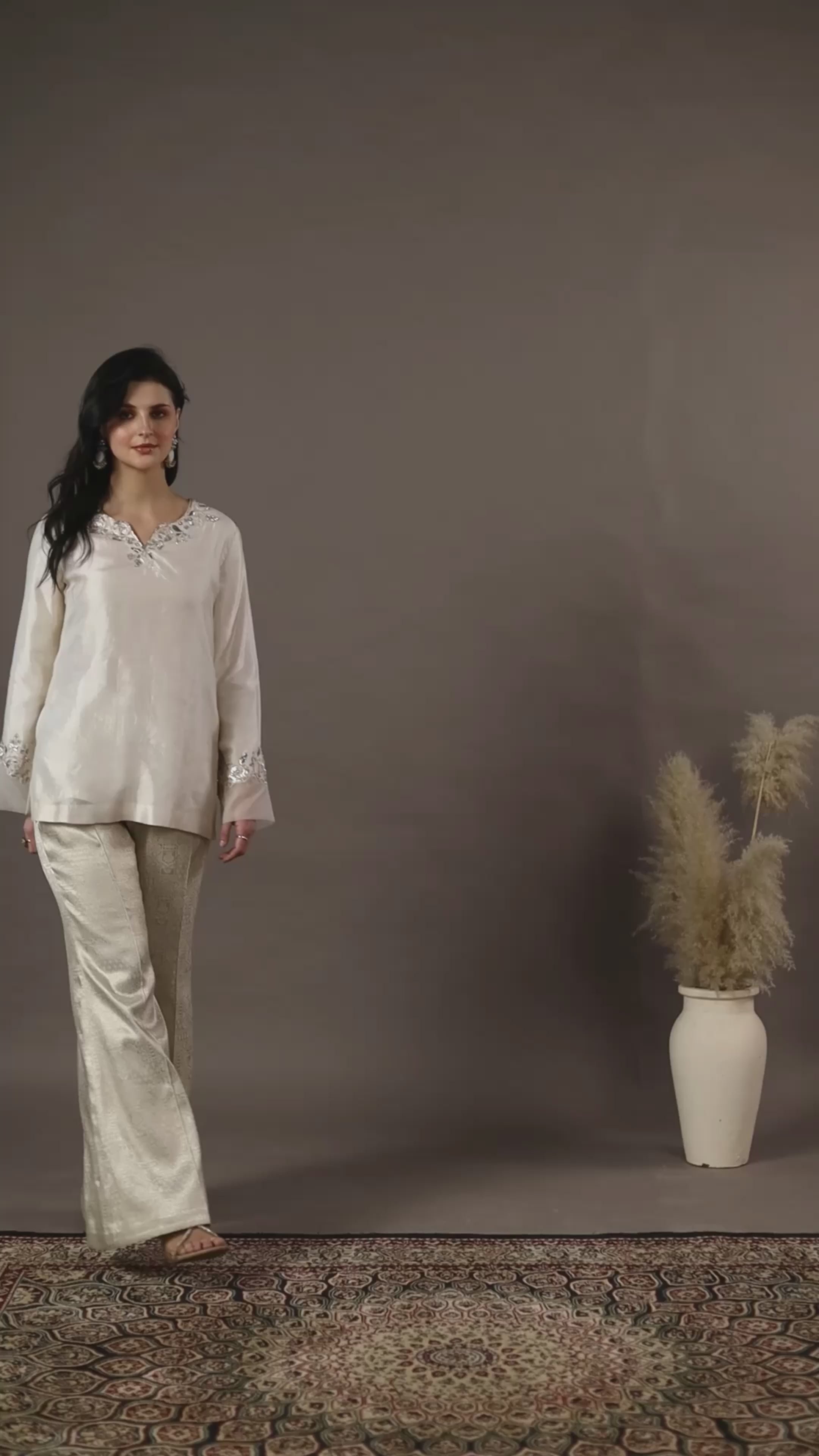 Elegant and timeless, this ivory silk kurta set for women features delicate hand embroidery with sequins, cutdana, crystals, and beads along a beautifully crafted floral neckline. The kurta is made from luxurious silk with a soft lining, offering a graceful drape and comfort. Paired with brocade trousers, this outfit creates a refined silhouette perfect for festive occasions, wedding functions, and other celebrations.