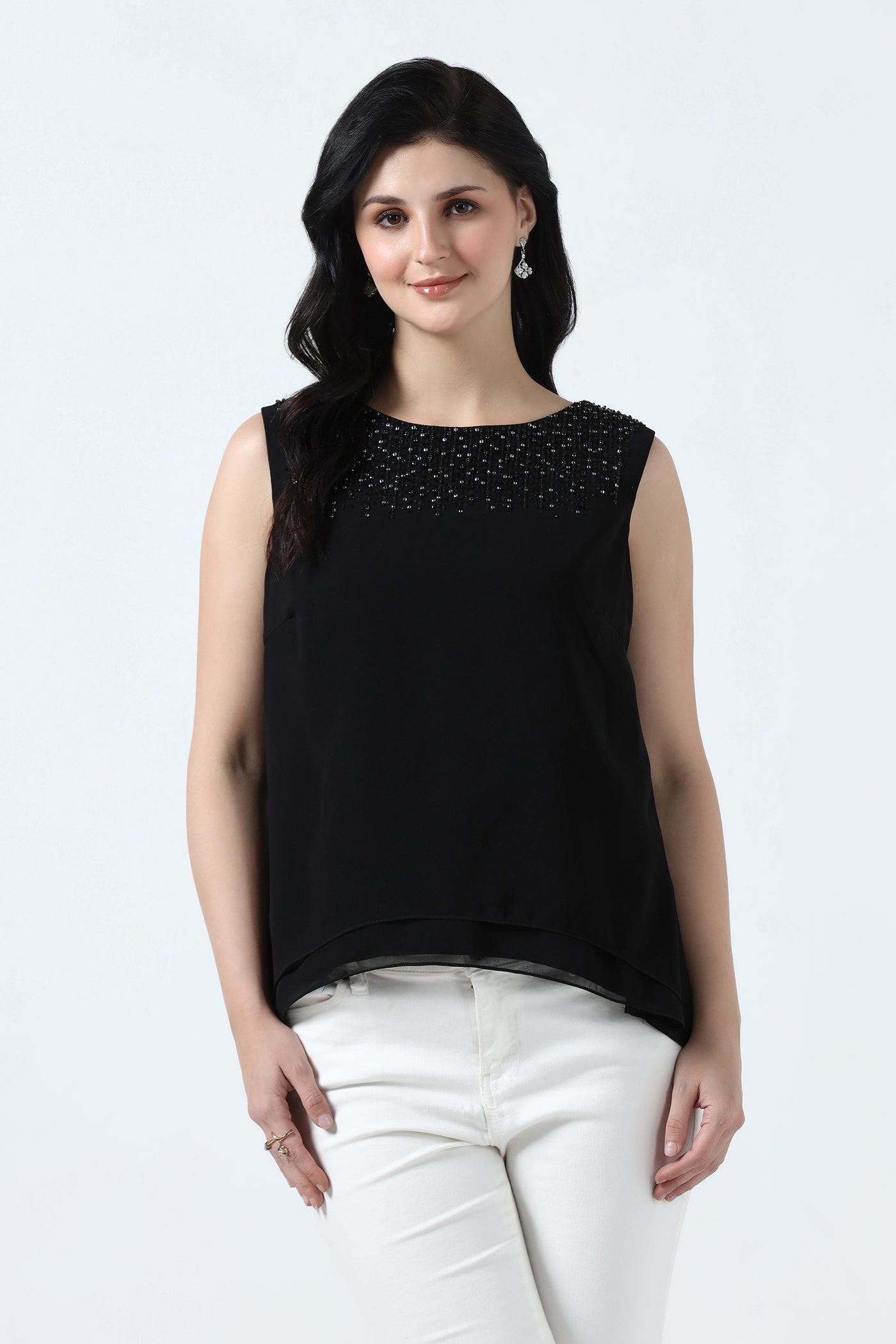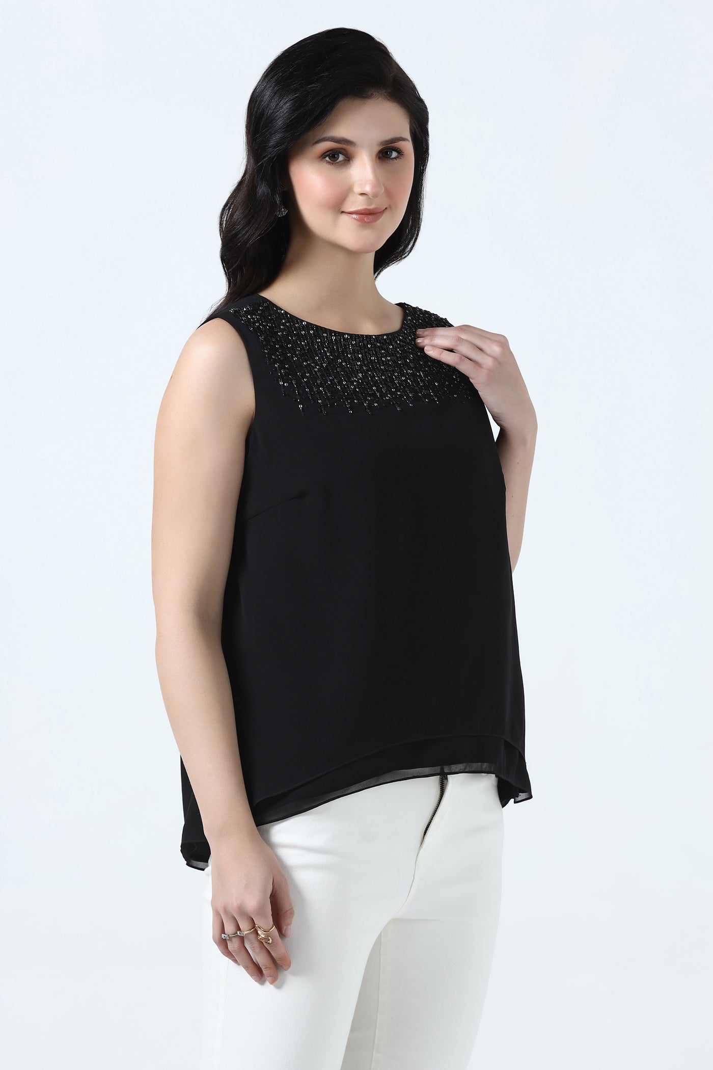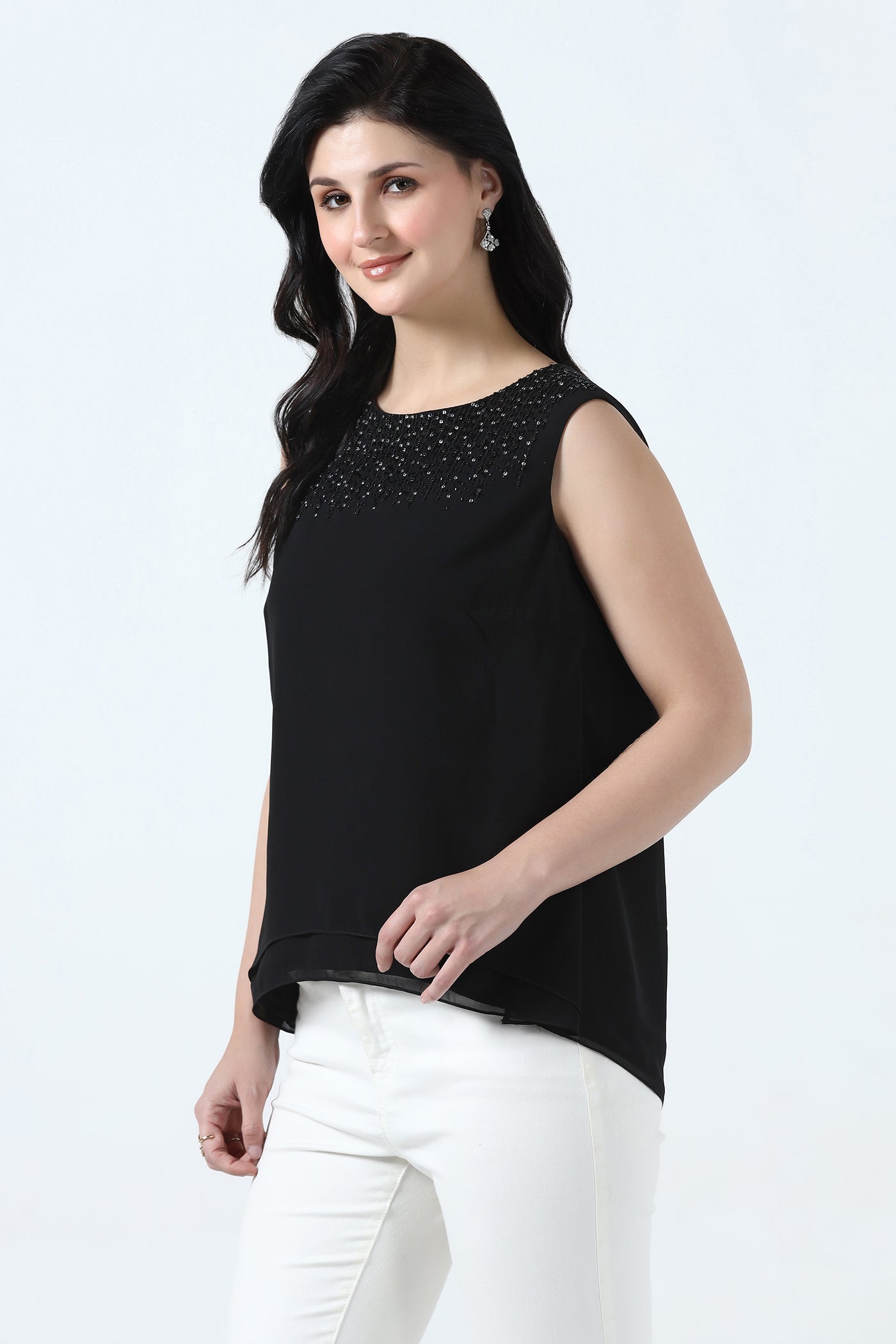 Elegant and versatile, this black georgette top features a soft crepe lining for a comfortable drape. The neckline is beautifully hand embroidered with crystals, sequins, rhinestones and beads adding subtle sparkle. Perfect for cocktail parties, evening events, and festive occasions. It pairs effortlessly with skirts or tailored pants.