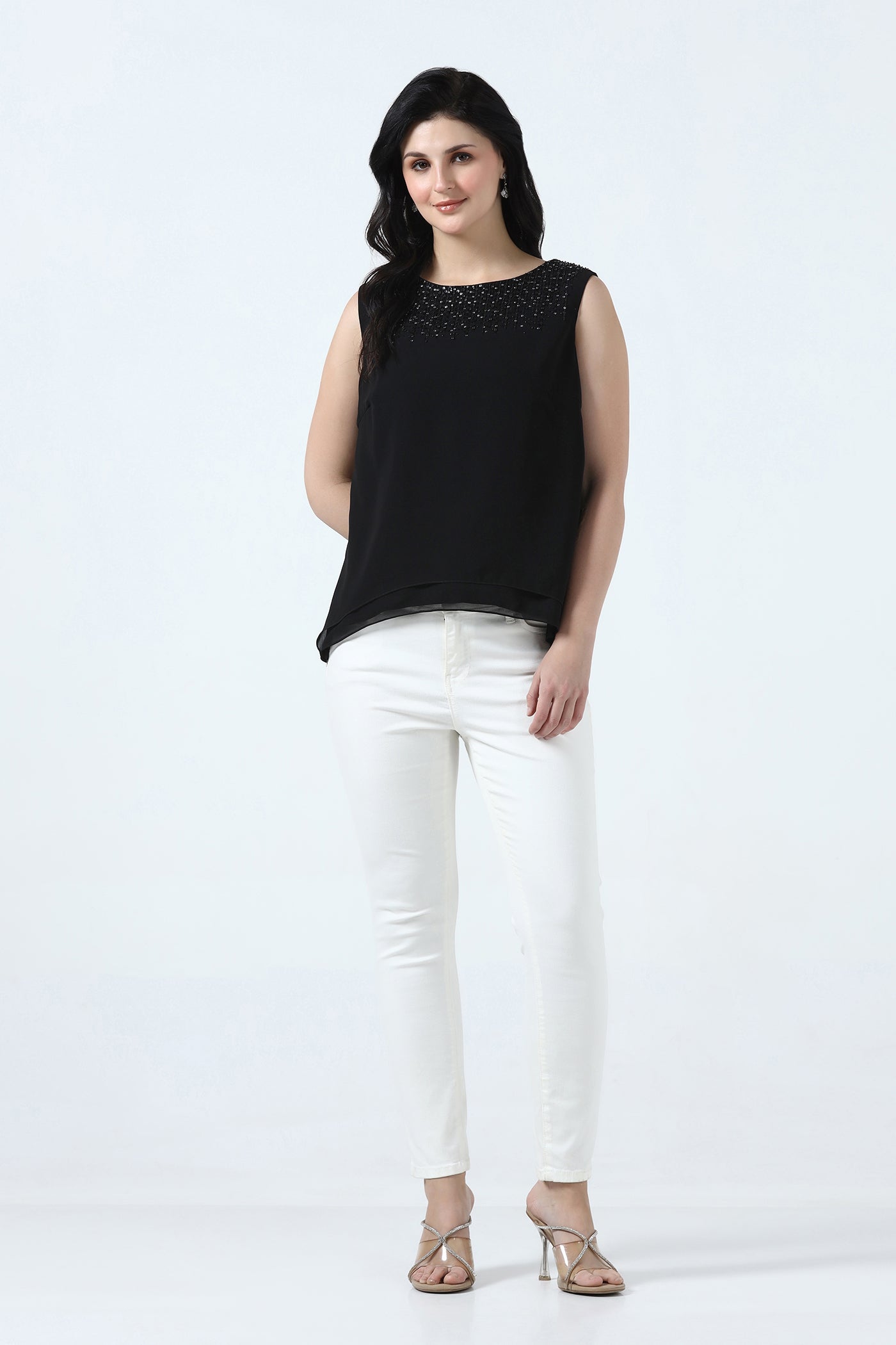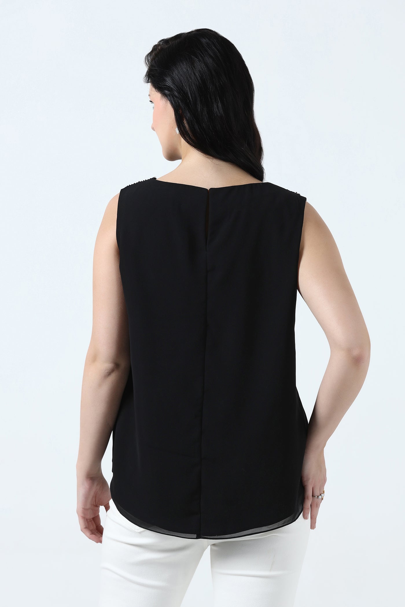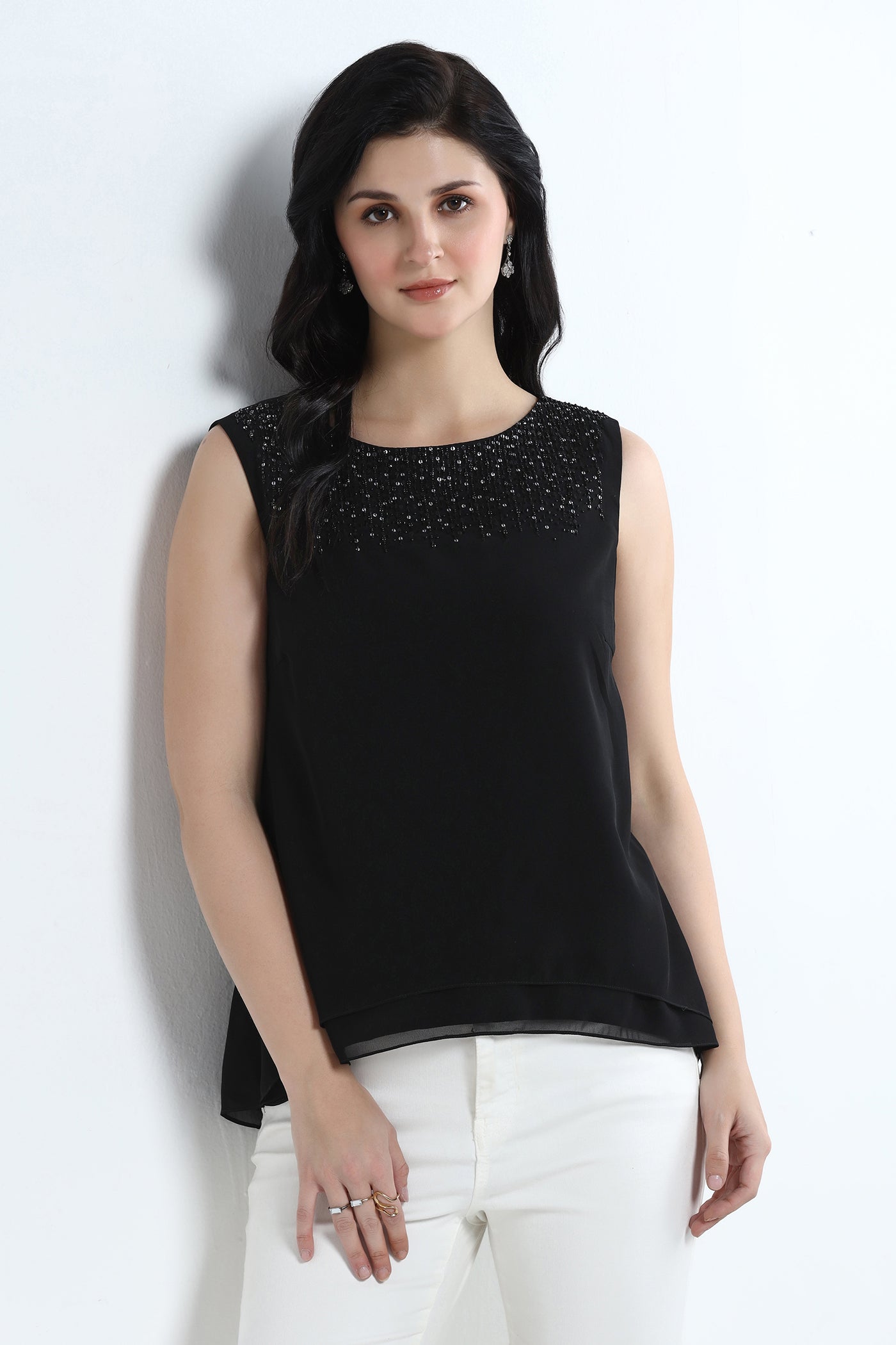 Elegant and versatile, this black georgette top features a soft crepe lining for a comfortable drape. The neckline is beautifully hand embroidered with crystals, sequins, rhinestones and beads adding subtle sparkle. Perfect for cocktail parties, evening events, and festive occasions. It pairs effortlessly with skirts or tailored pants.
