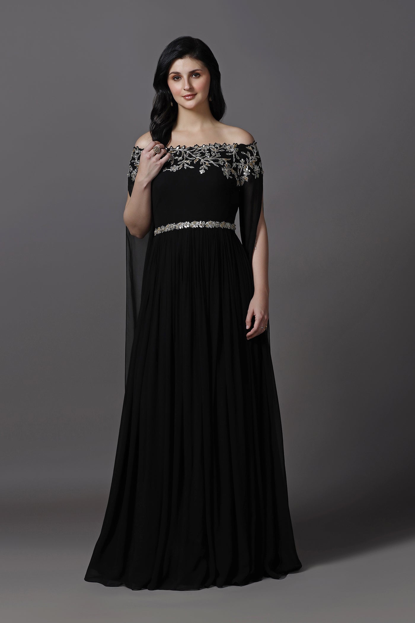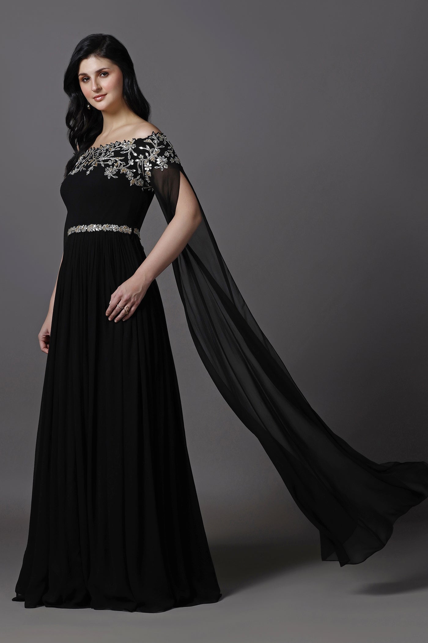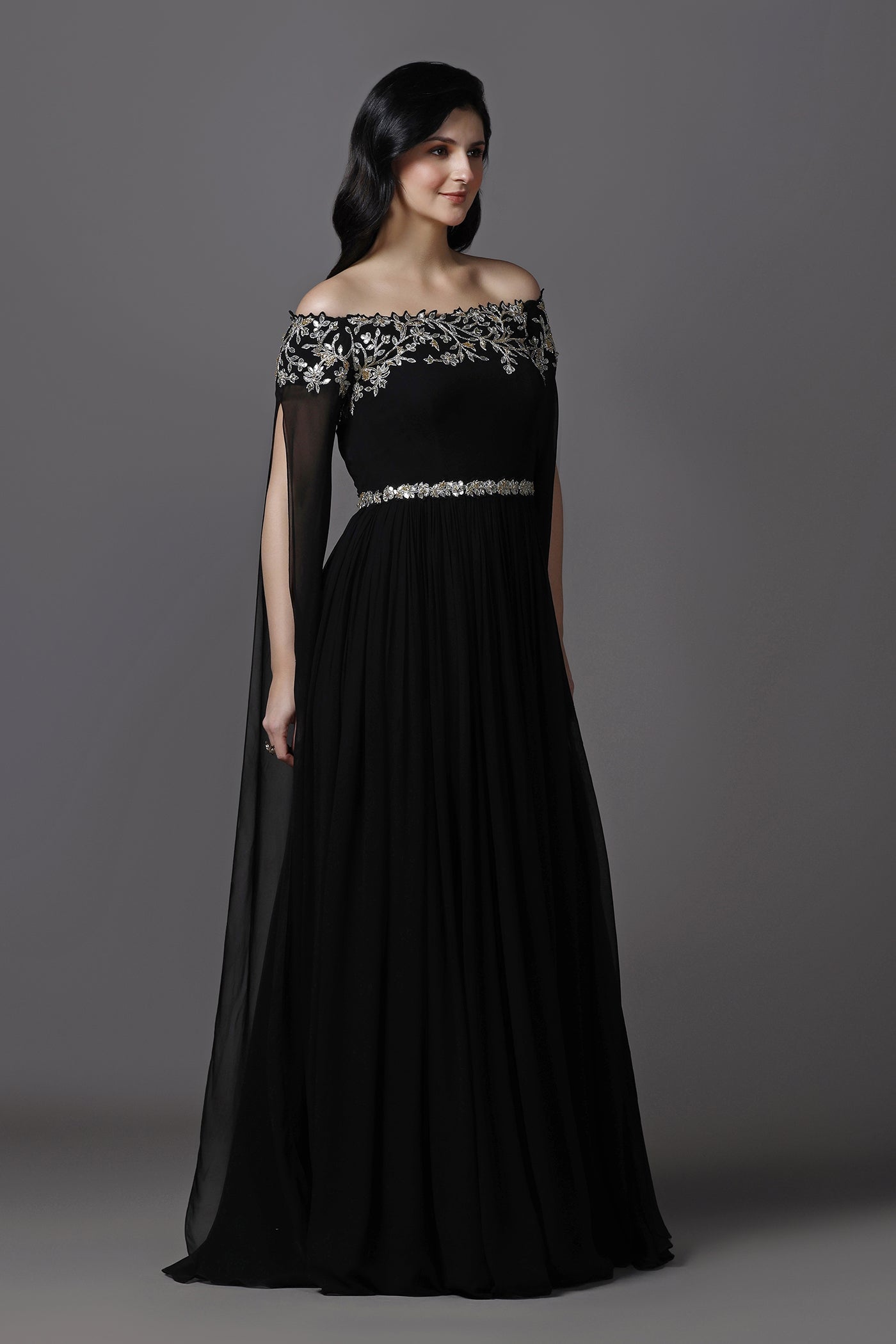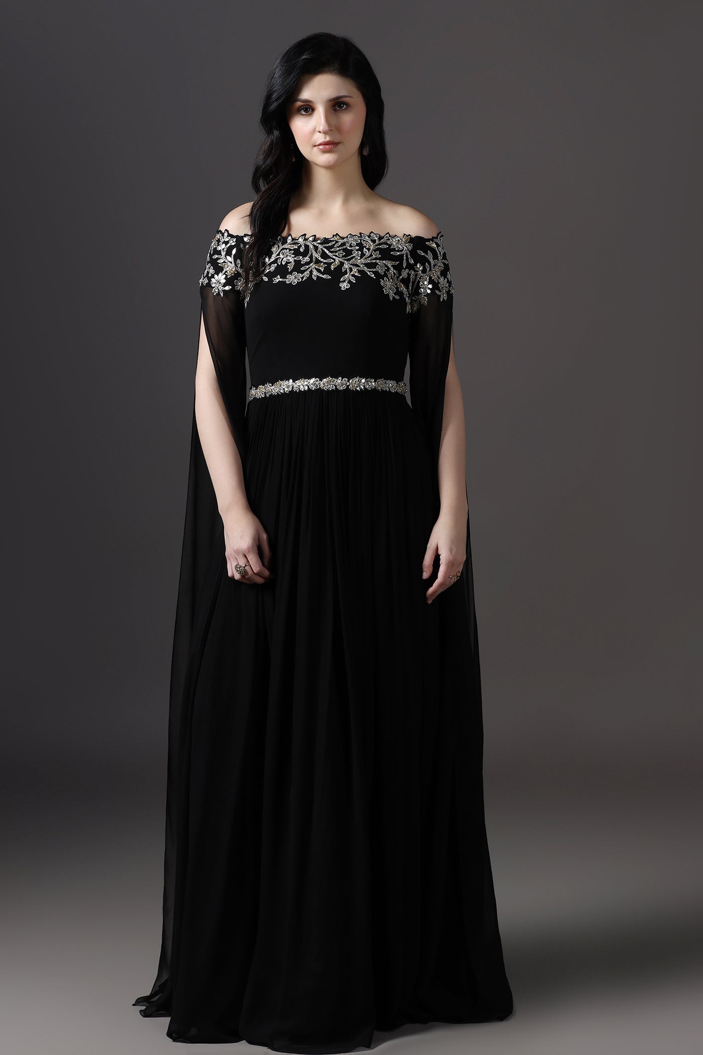 Make a statement in this elegant black evening gown, designed with a graceful off-shoulder neckline and dramatic royal cape style sleeves. Crafted from lightweight georgette with a soft lining, the gown features hand embroidery with beads, crystals, and sequins that add a refined sparkle. Perfect for evening events, cocktail parties, receptions, and formal occasions, this gown blends timeless elegance with modern glamour.