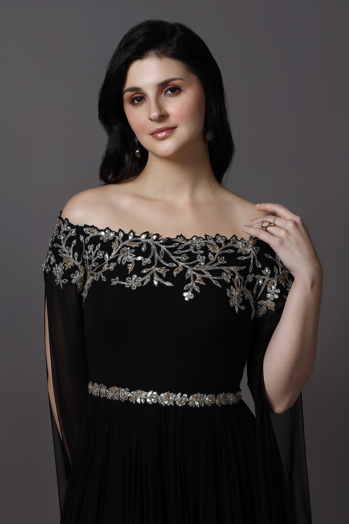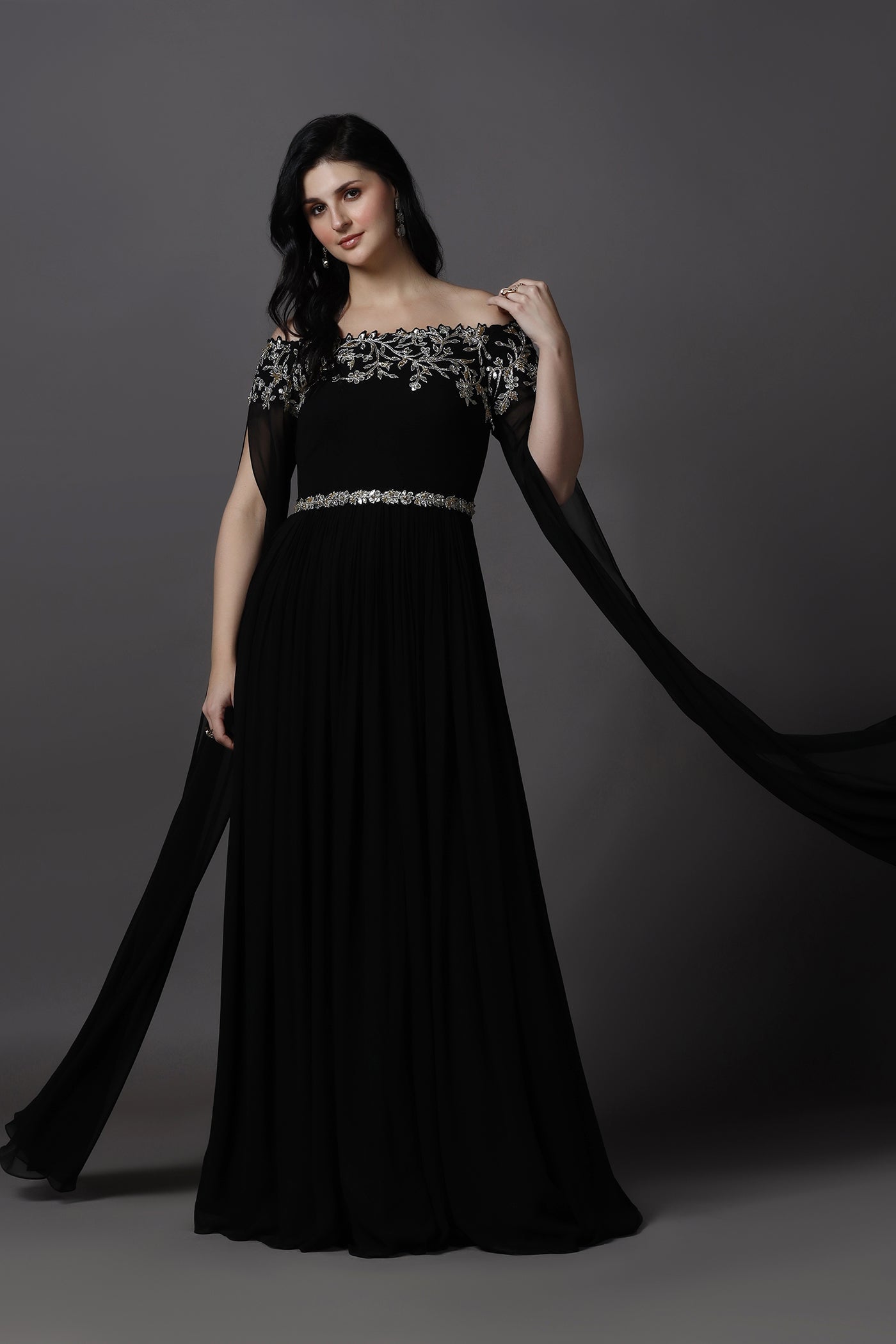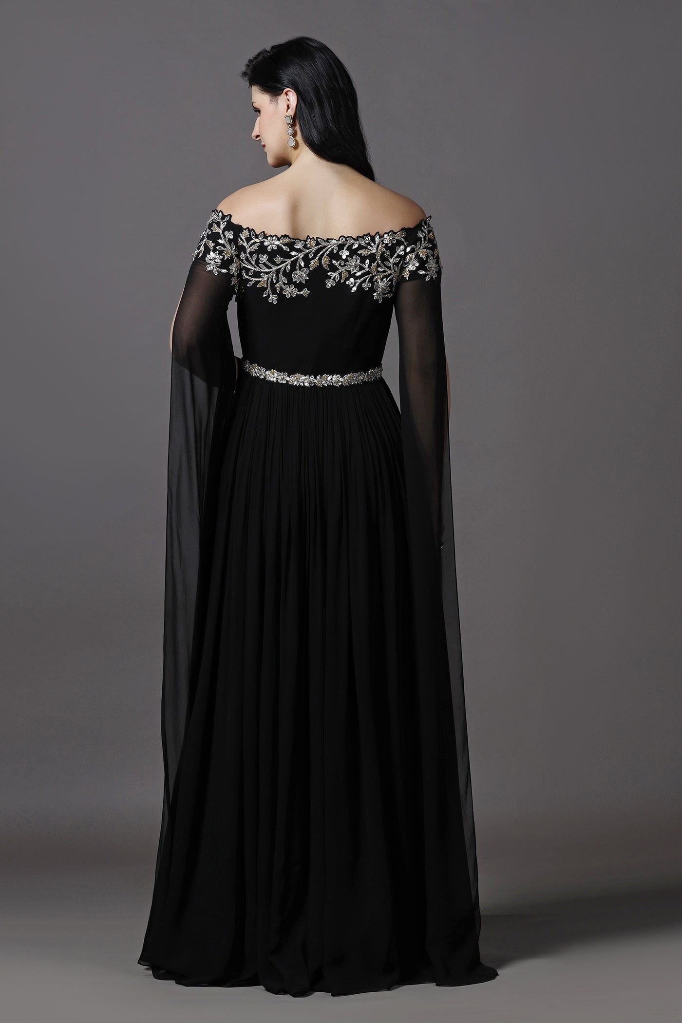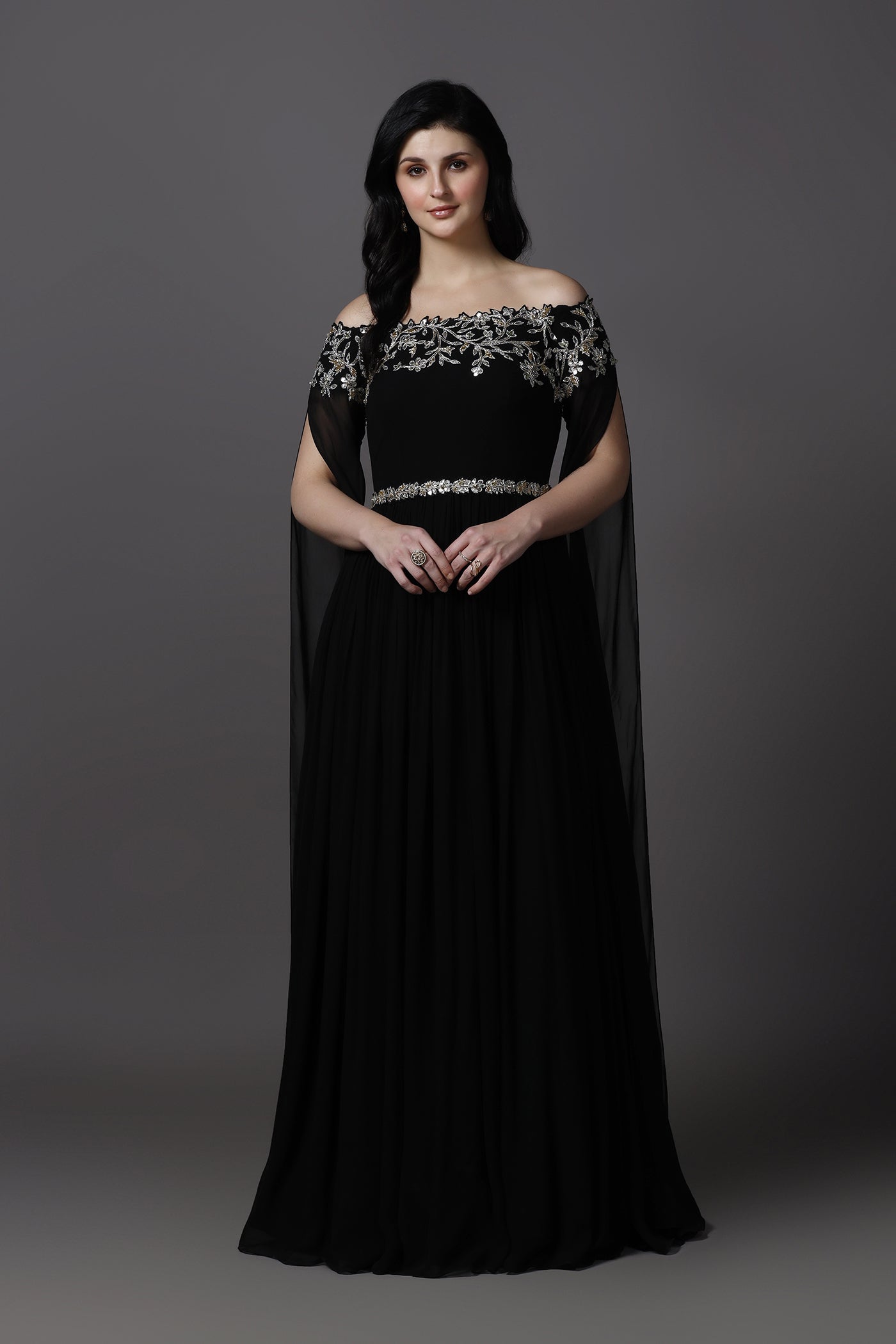Make a statement in this elegant black evening gown, designed with a graceful off-shoulder neckline and dramatic royal cape style sleeves. Crafted from lightweight georgette with a soft lining, the gown features hand embroidery with beads, crystals, and sequins that add a refined sparkle. Perfect for evening events, cocktail parties, receptions, and formal occasions, this gown blends timeless elegance with modern glamour.