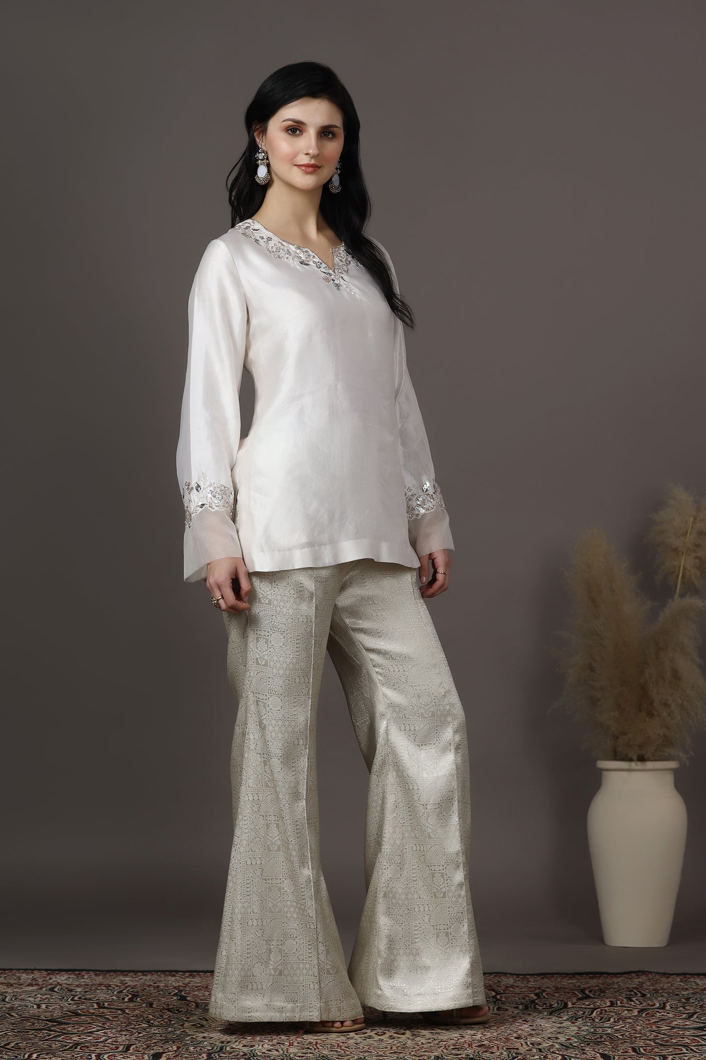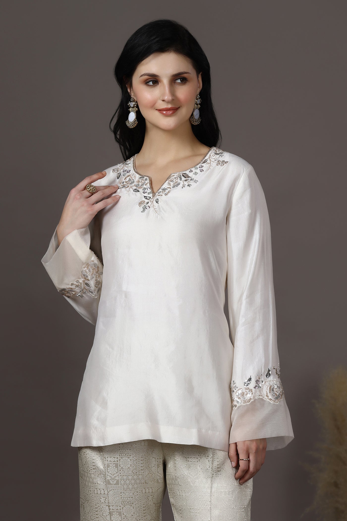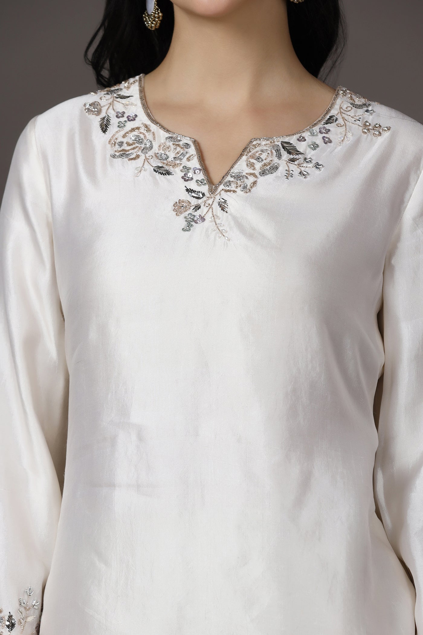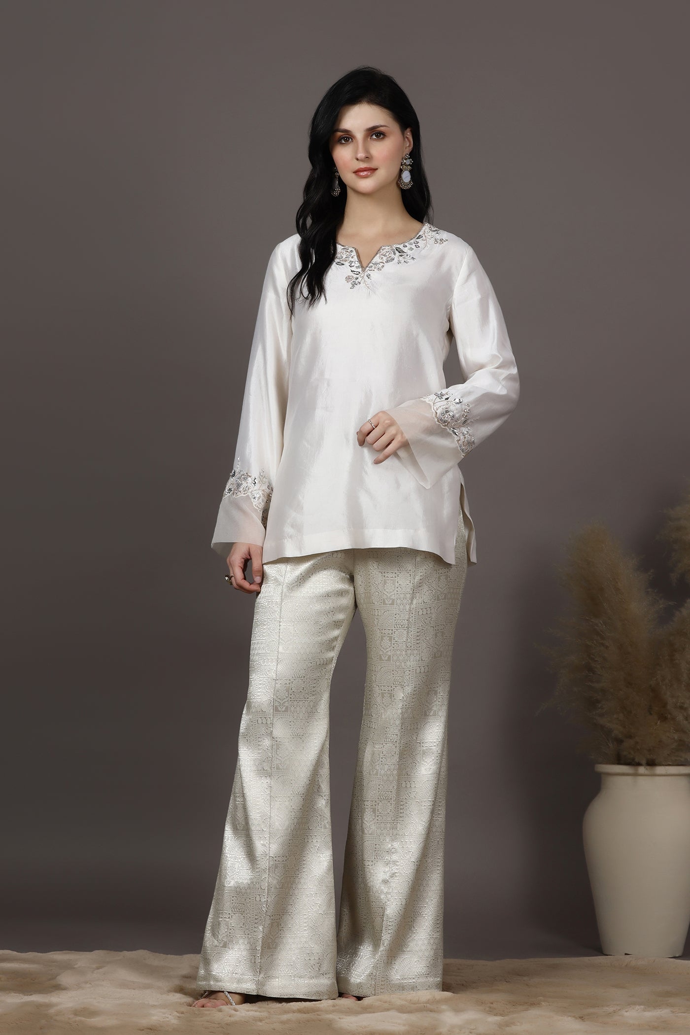 Elegant and timeless, this ivory silk kurta set for women features delicate hand embroidery with sequins, cutdana, crystals, and beads along a beautifully crafted floral neckline. The kurta is made from luxurious silk with a soft lining, offering a graceful drape and comfort. Paired with brocade trousers, this outfit creates a refined silhouette perfect for festive occasions, wedding functions, and other celebrations.