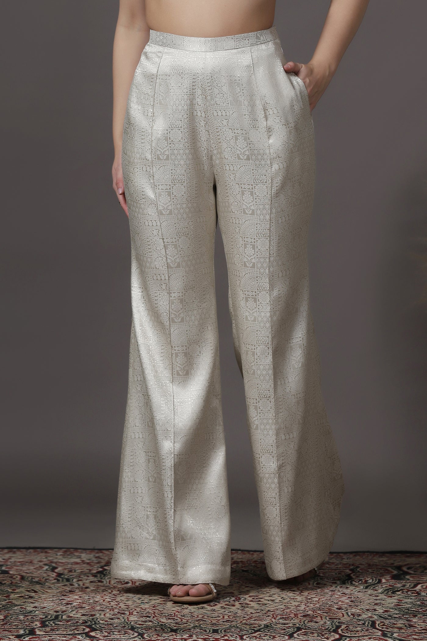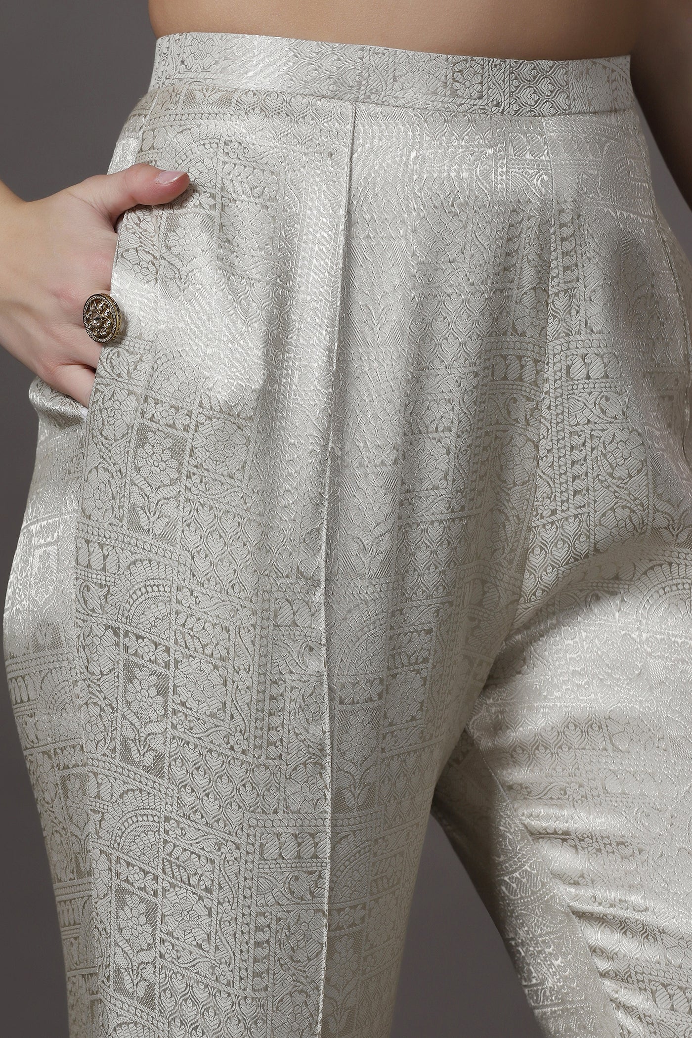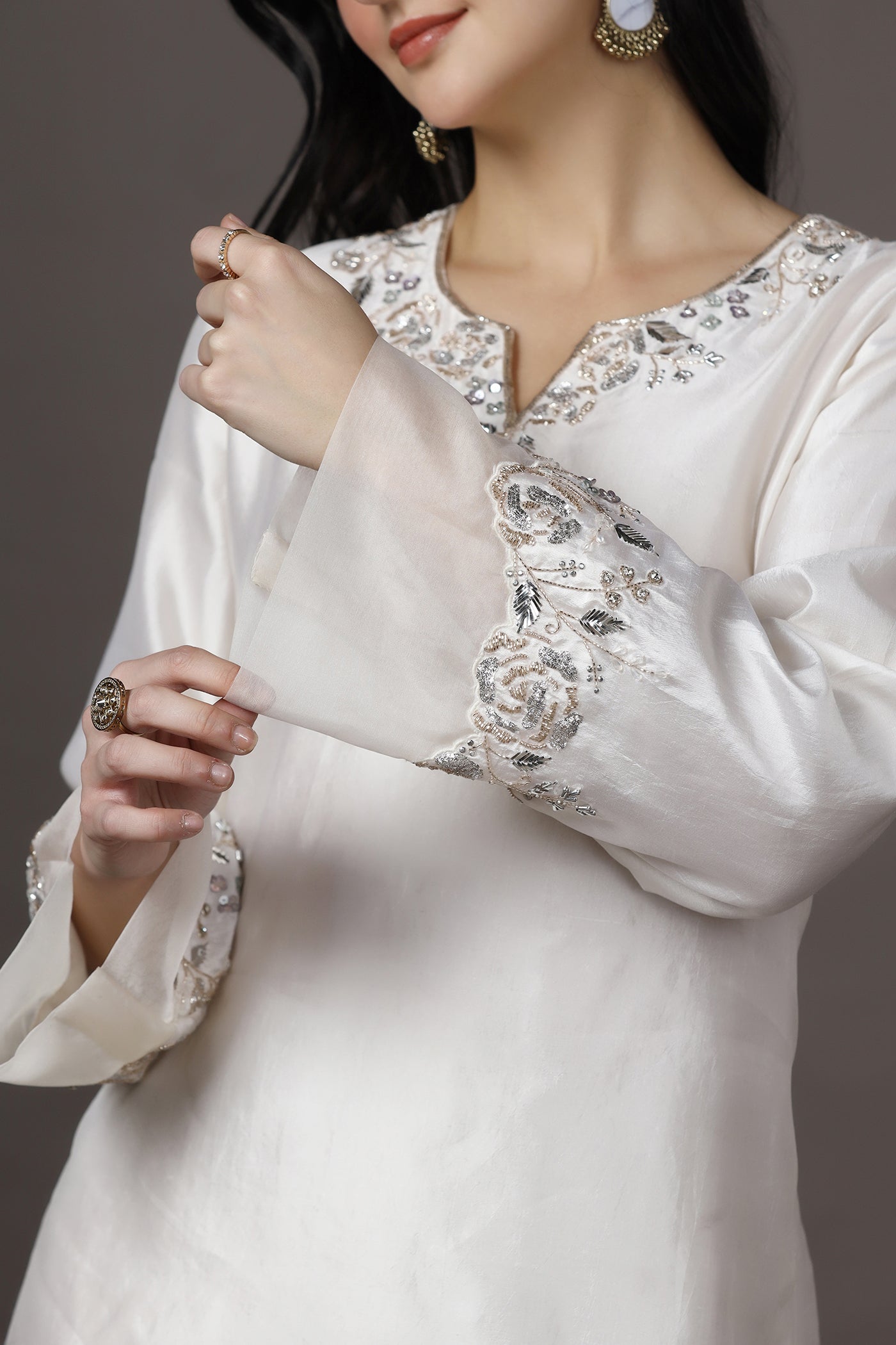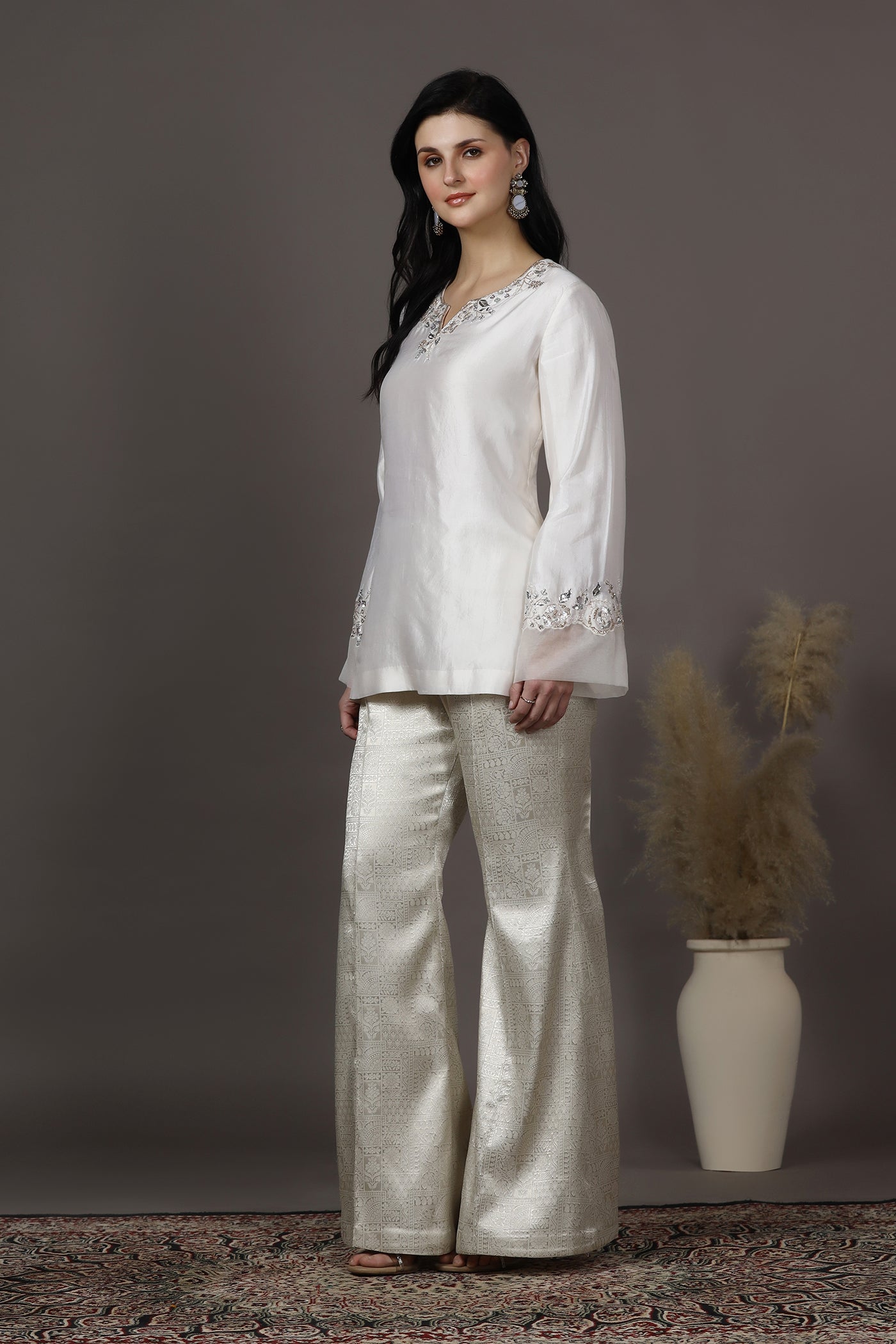 Elegant and timeless, this ivory silk kurta set for women features delicate hand embroidery with sequins, cutdana, crystals, and beads along a beautifully crafted floral neckline. The kurta is made from luxurious silk with a soft lining, offering a graceful drape and comfort. Paired with brocade trousers, this outfit creates a refined silhouette perfect for festive occasions, wedding functions, and other celebrations.