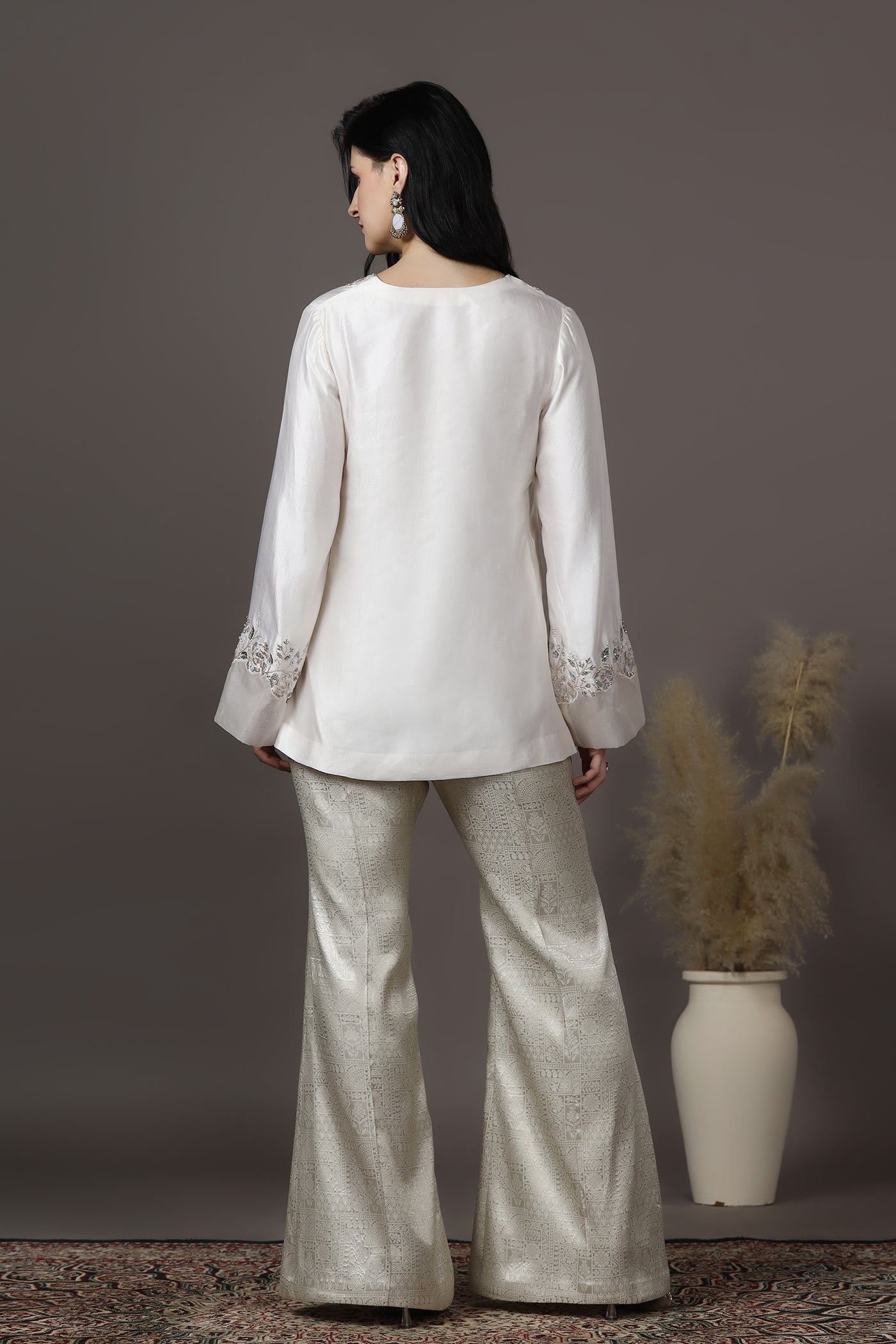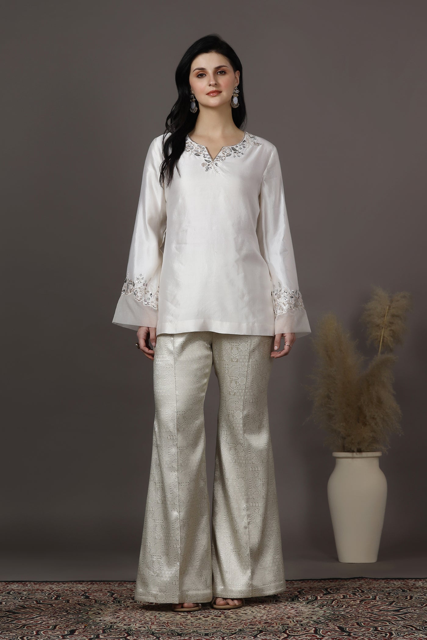 Ivory Silk Hand Embroidered Kurta Set with Brocade Bell Bottom Trousers