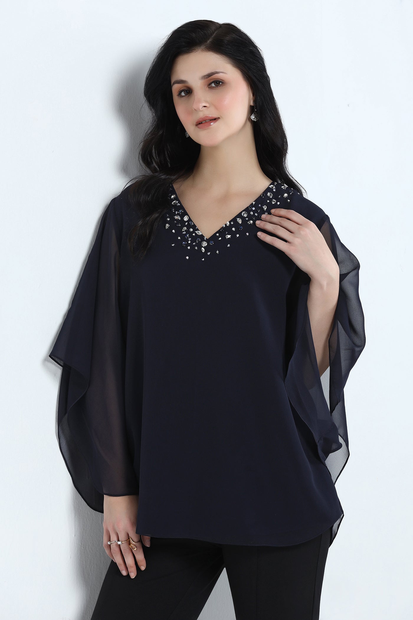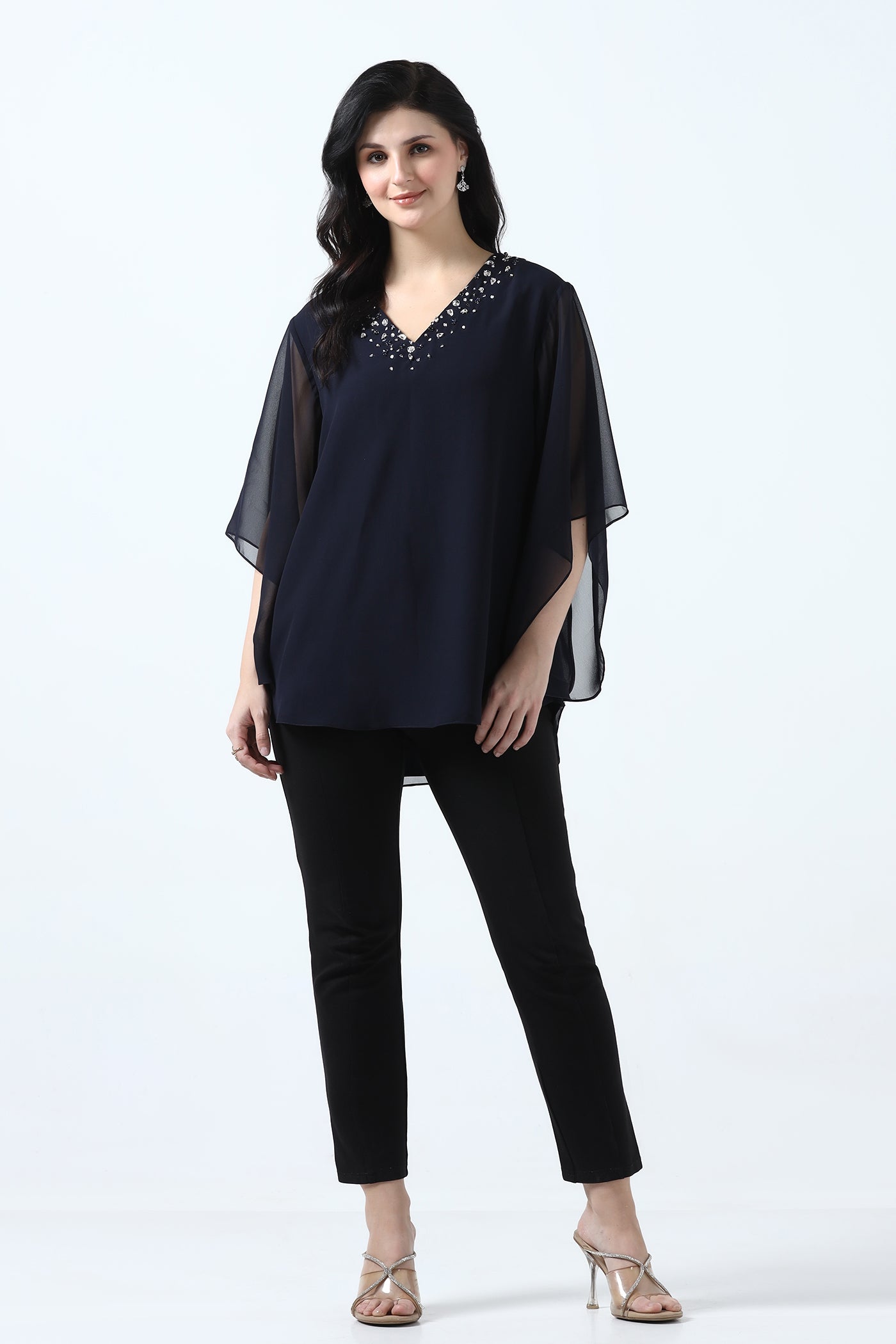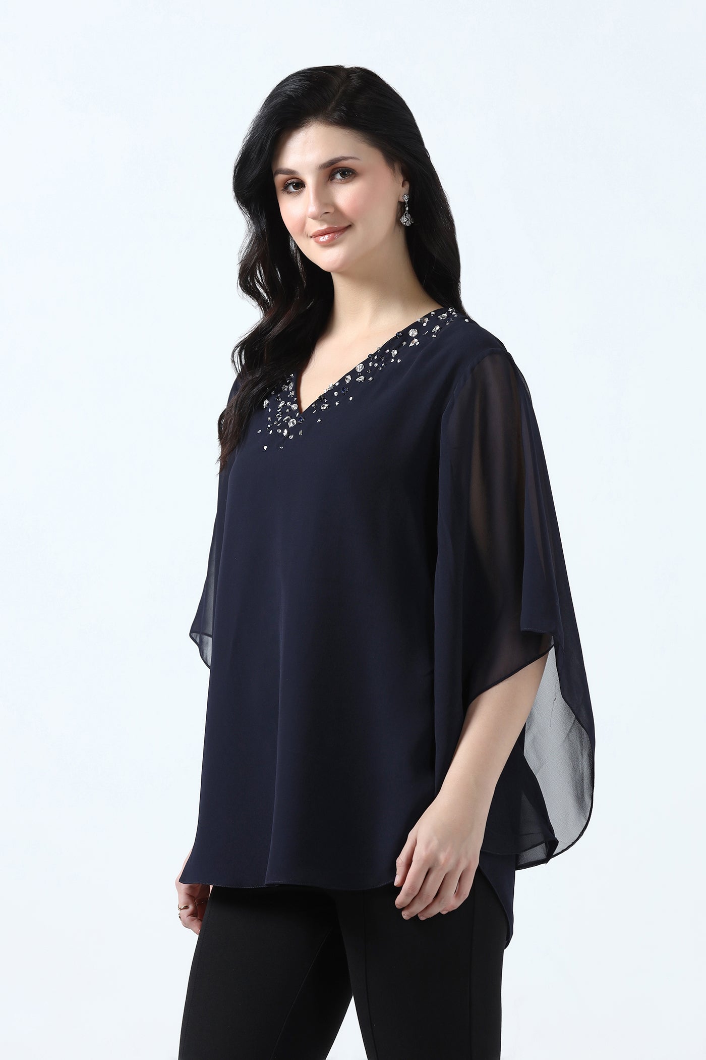 Elegant and lightweight, this navy blue georgette top features a soft crepe lining for a comfortable drape. The V-neckline is hand embroidered with crystals, rhinestones, and sequins adding subtle sparkle, while the flowy cape style sleeves create a graceful silhouette. Perfect for evening wear, cocktail parties, and festive occasions.