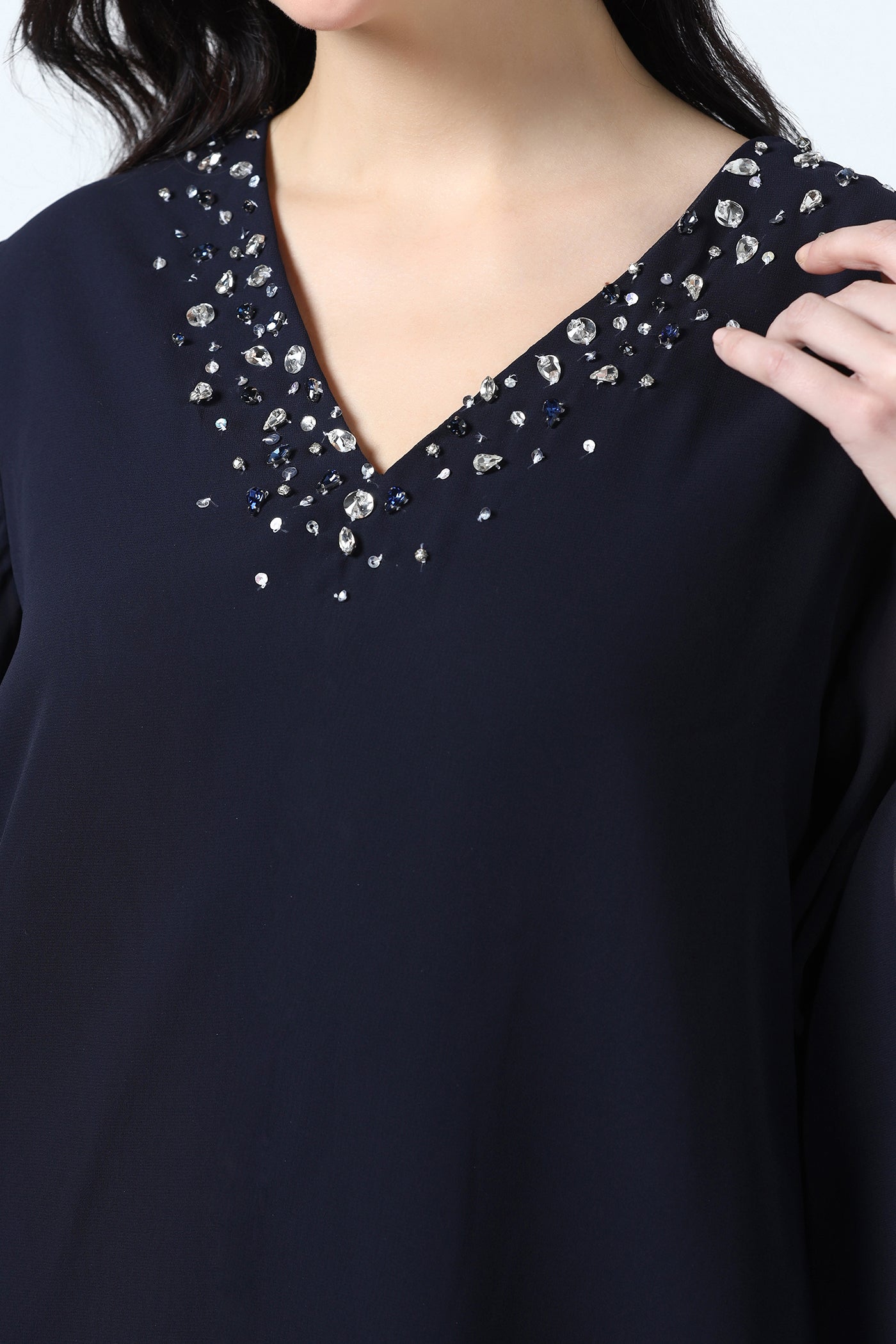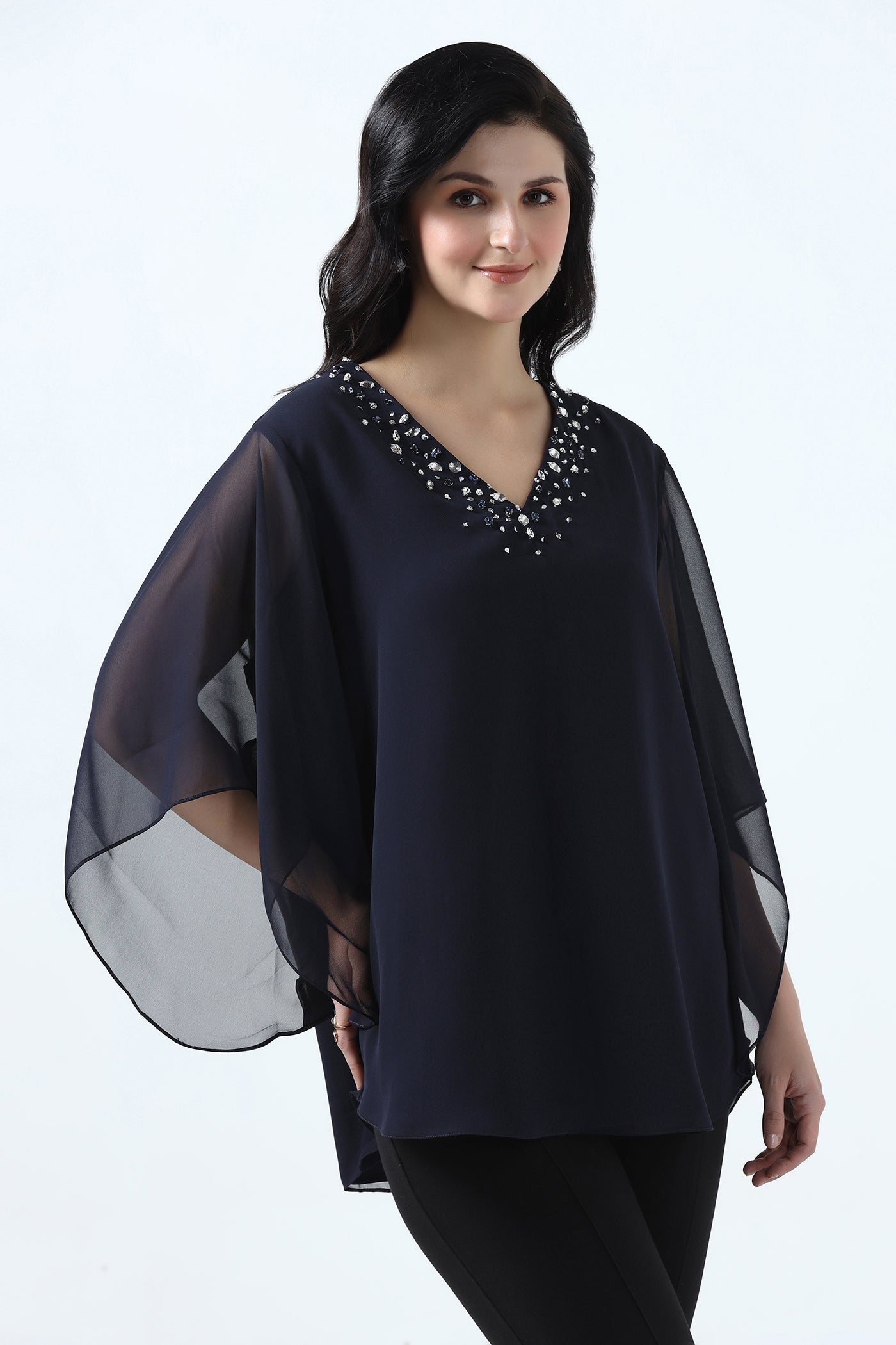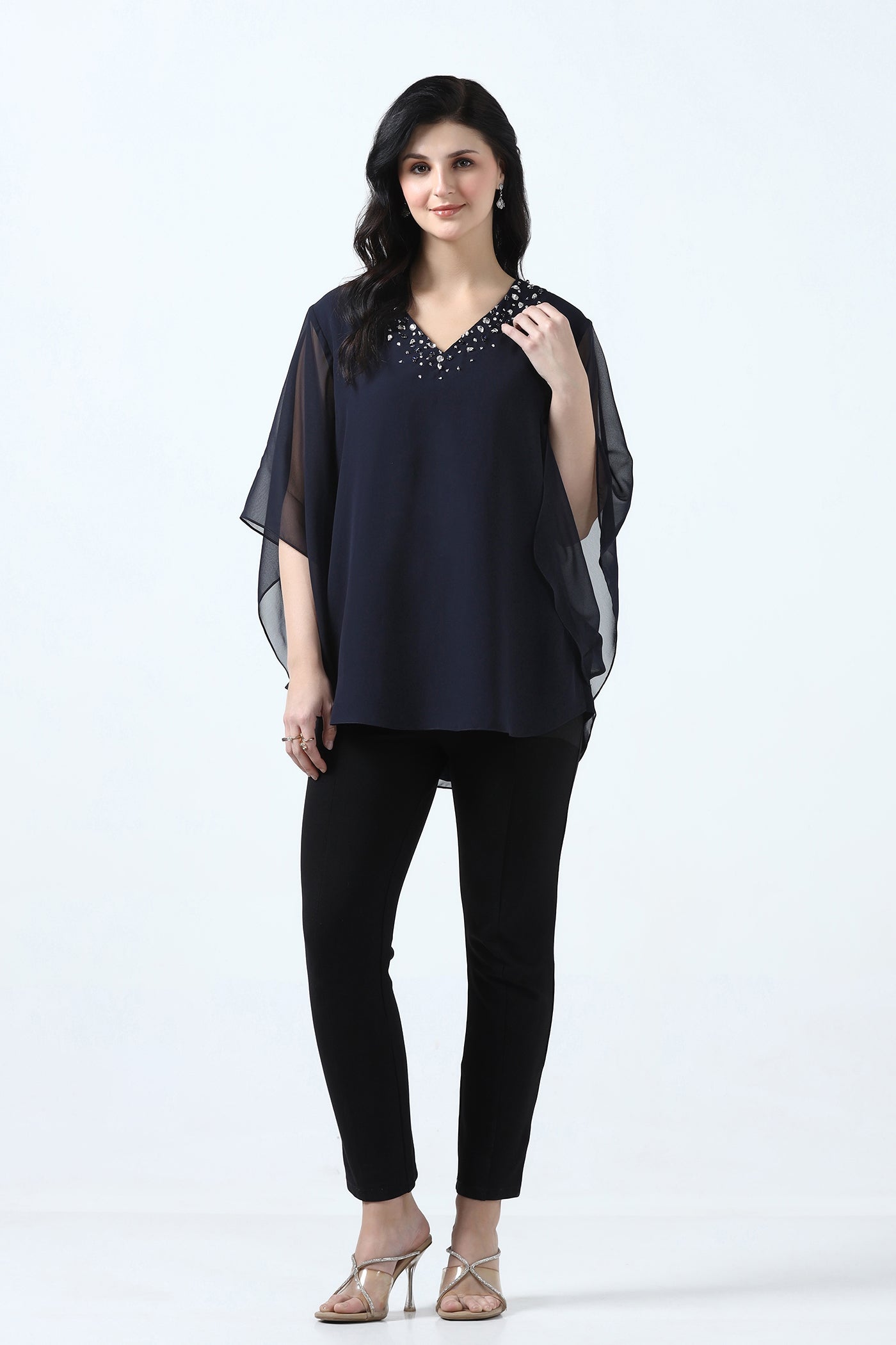 Elegant and lightweight, this navy blue georgette top features a soft crepe lining for a comfortable drape. The V-neckline is hand embroidered with crystals, rhinestones, and sequins adding subtle sparkle, while the flowy cape style sleeves create a graceful silhouette. Perfect for evening wear, cocktail parties, and festive occasions.